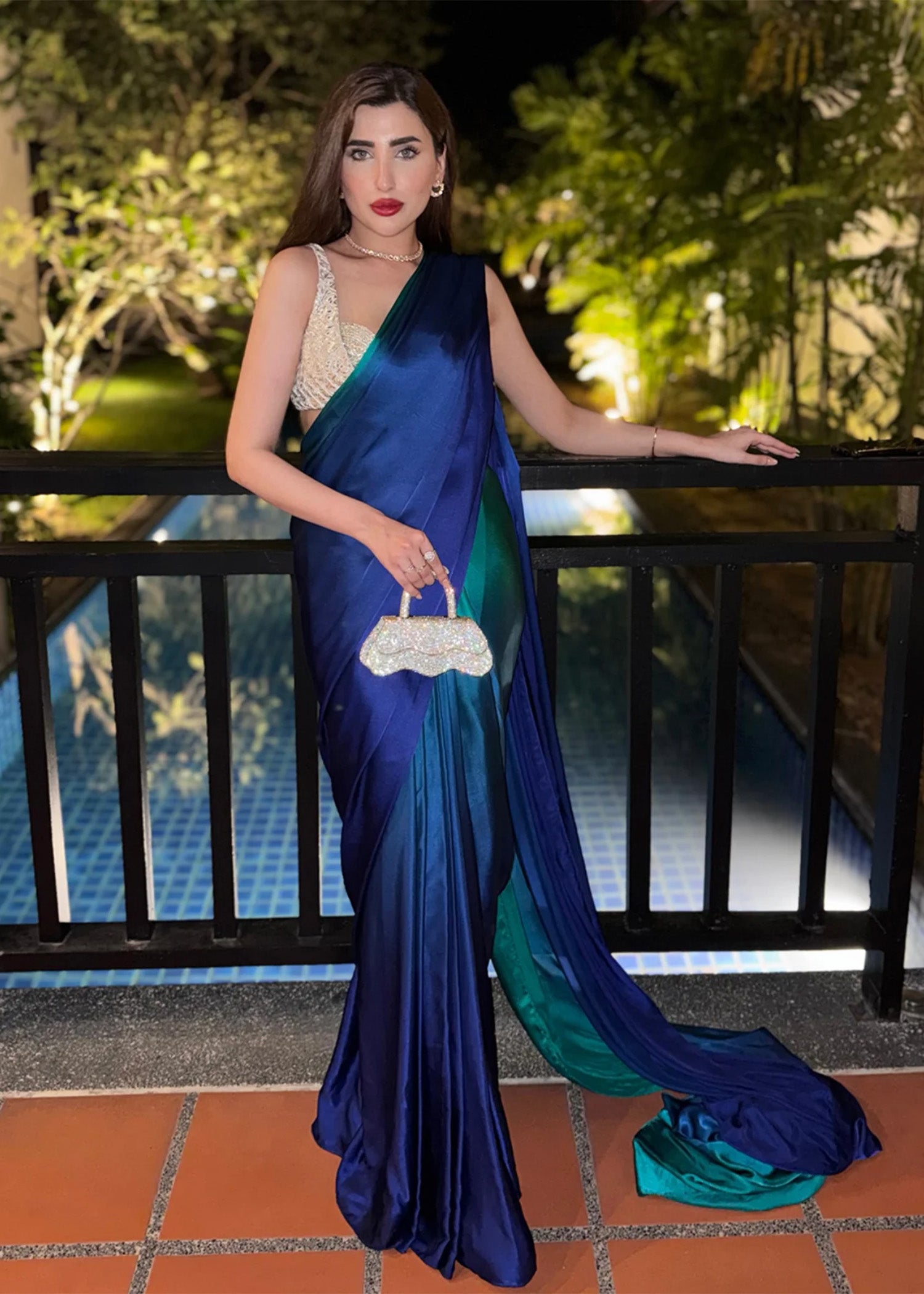 Get the temperature soaring in this Uber glam dip dyed charmeuse silk saree that takes inspiration from the shades of a gorgeous peacock! Comes with a hand crafted blouse that has been made using a hand woven gota fabric. Layered in style with a crystal peekaboo insert.