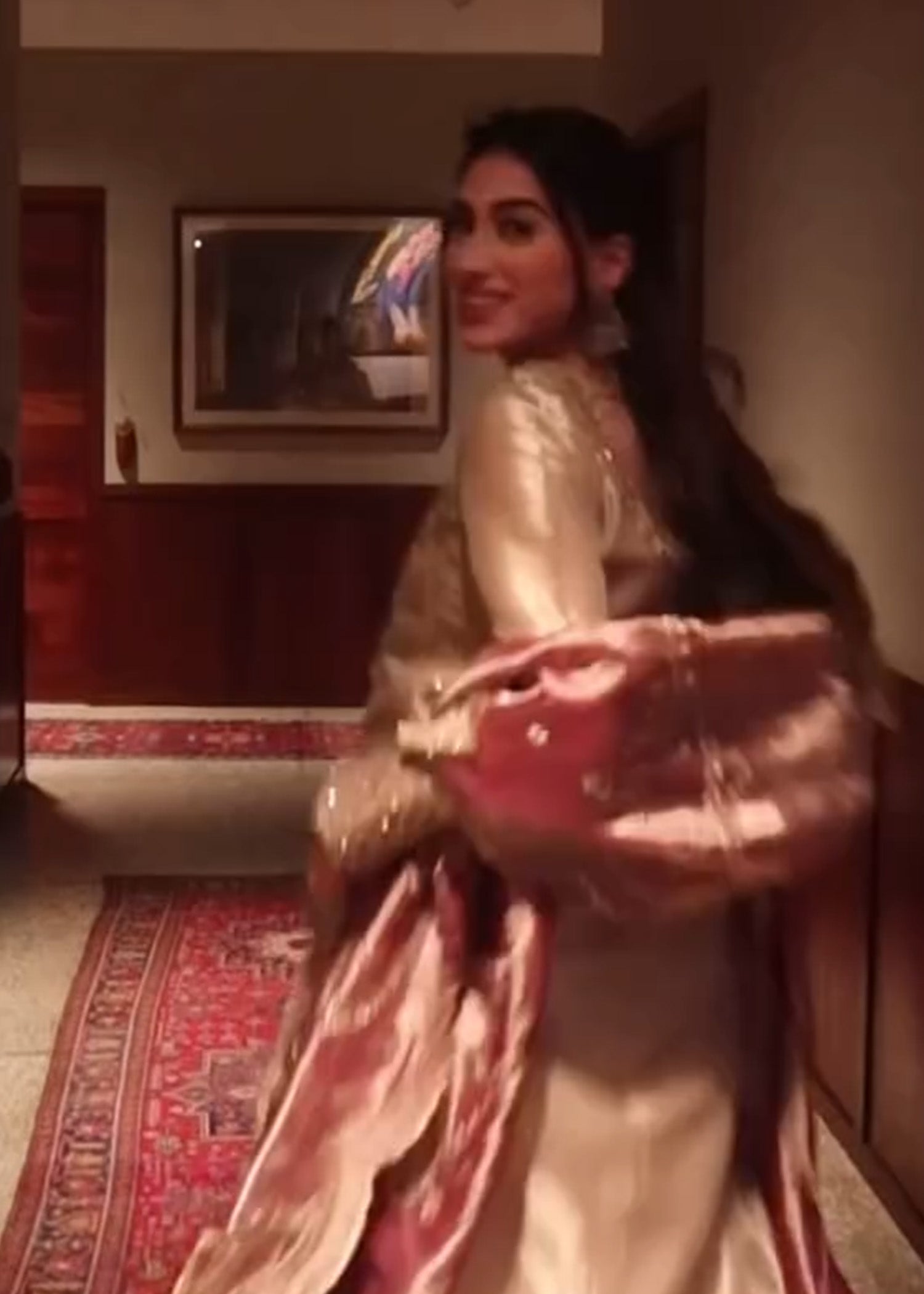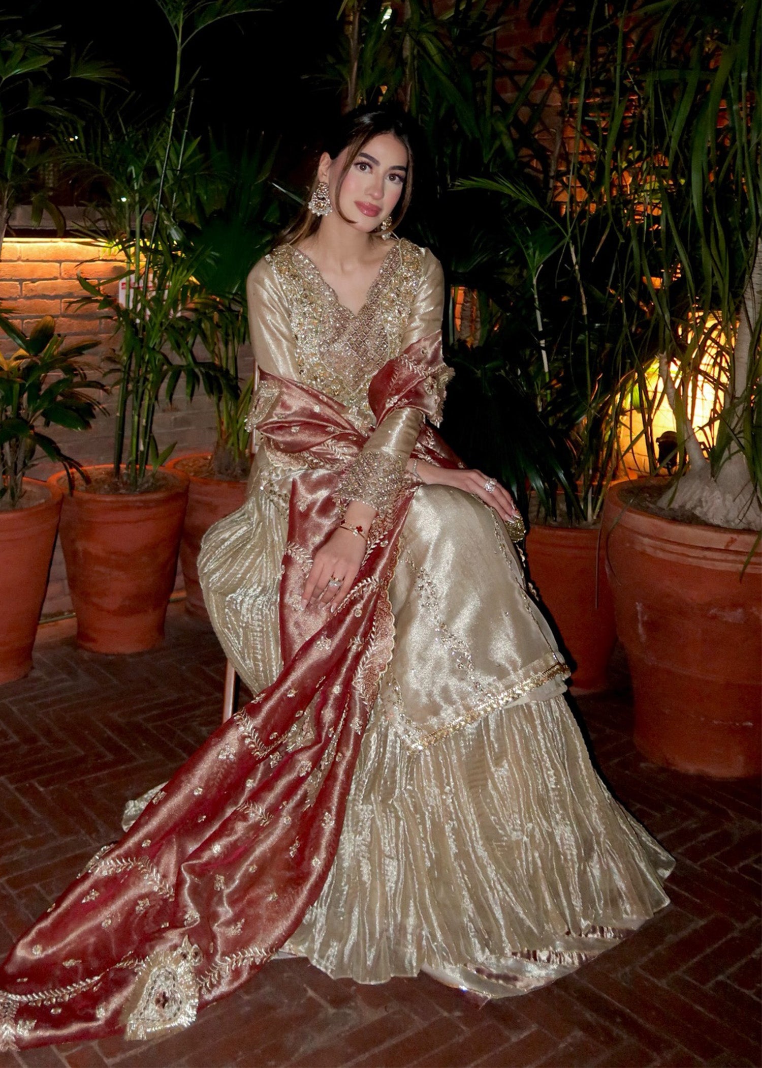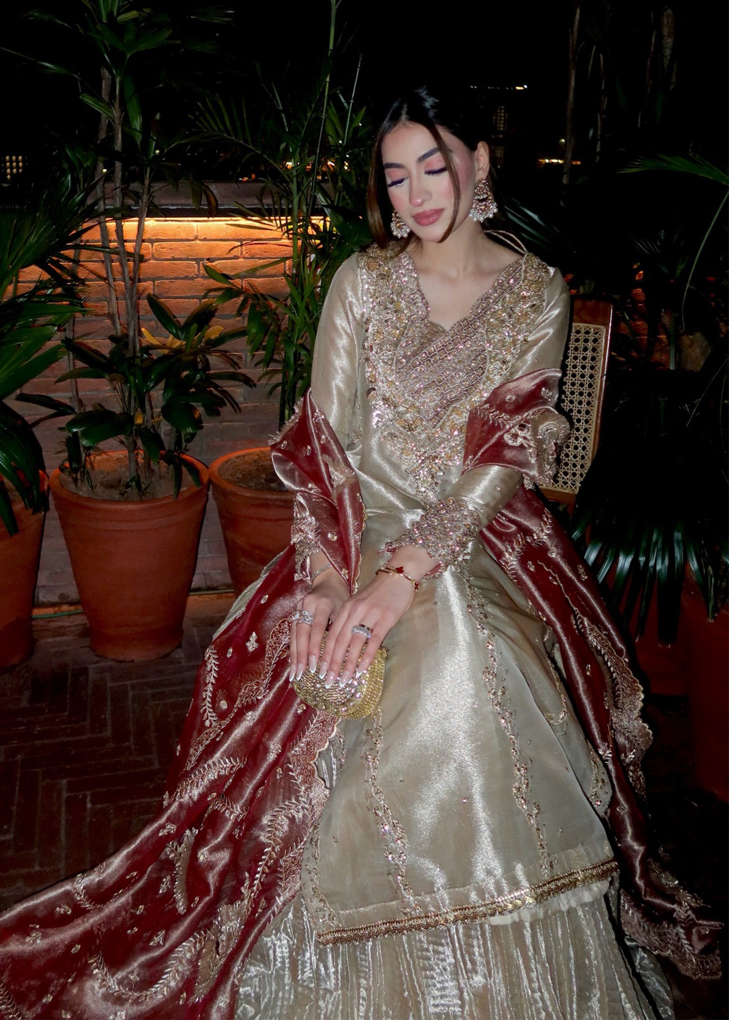 Paired with a crushed matching sharara and a coral toned gorgeous dupatta crafted with heart shaped motifs in embroidery and Kiran based embellished techniques to add that regal old school charm.