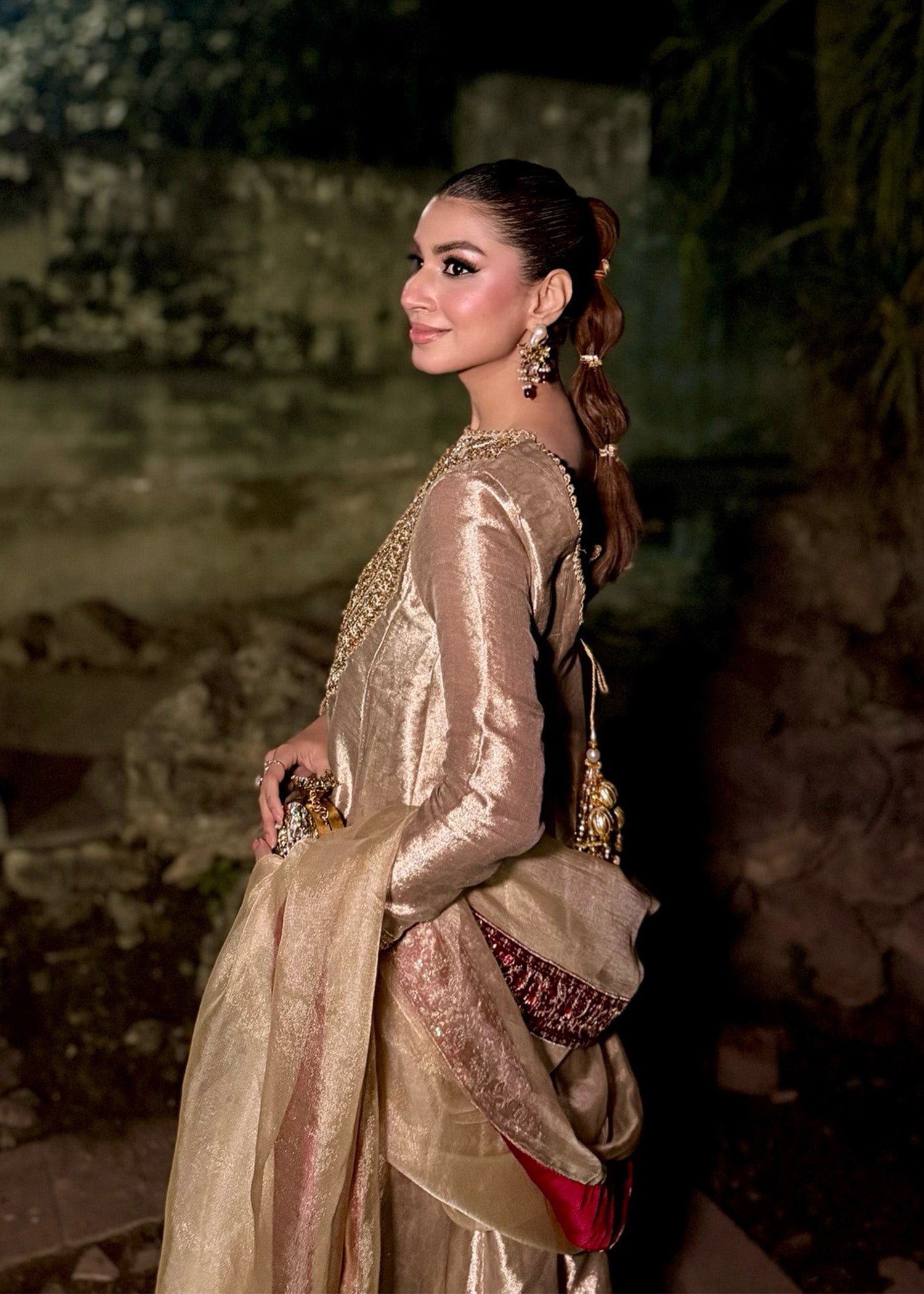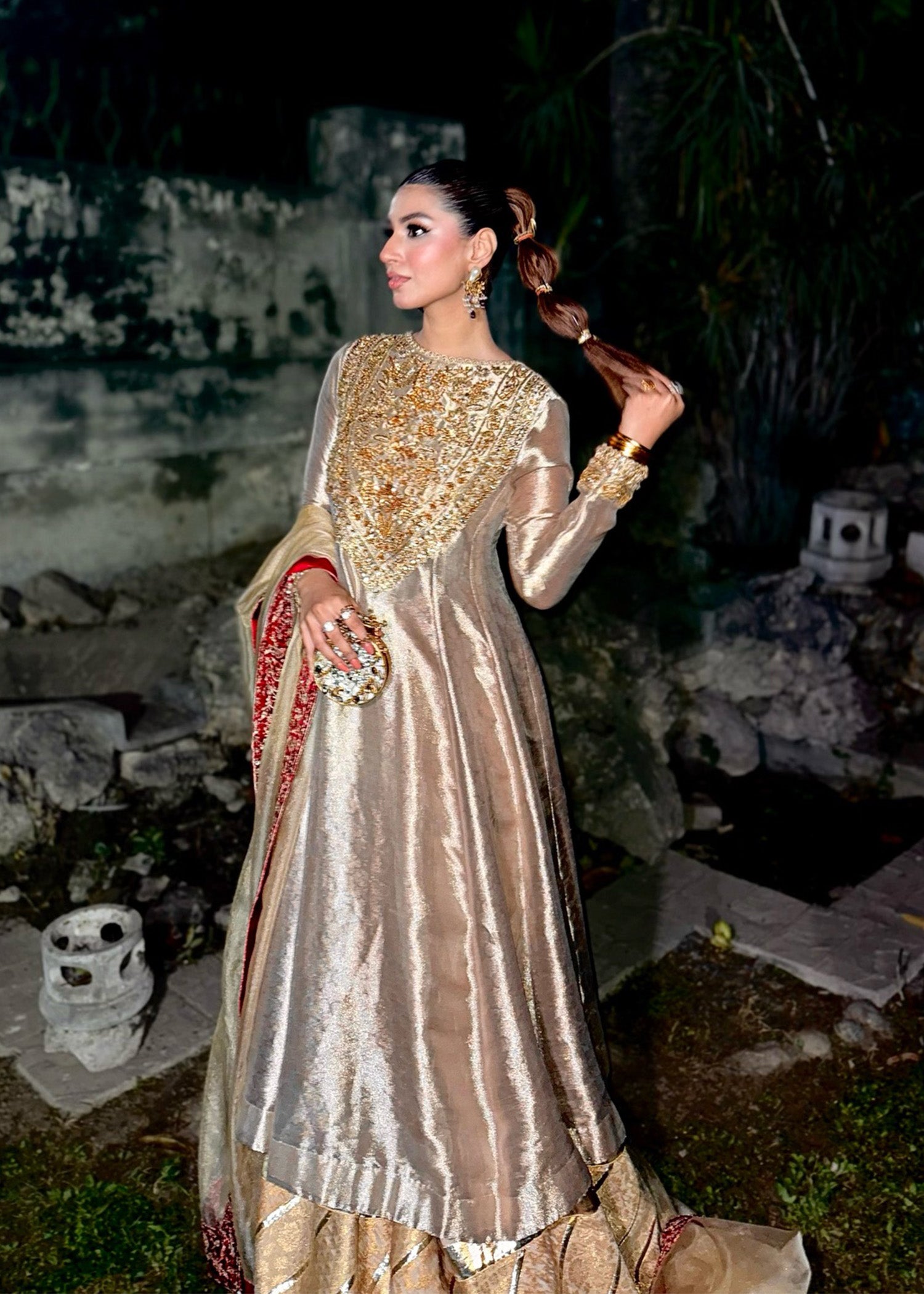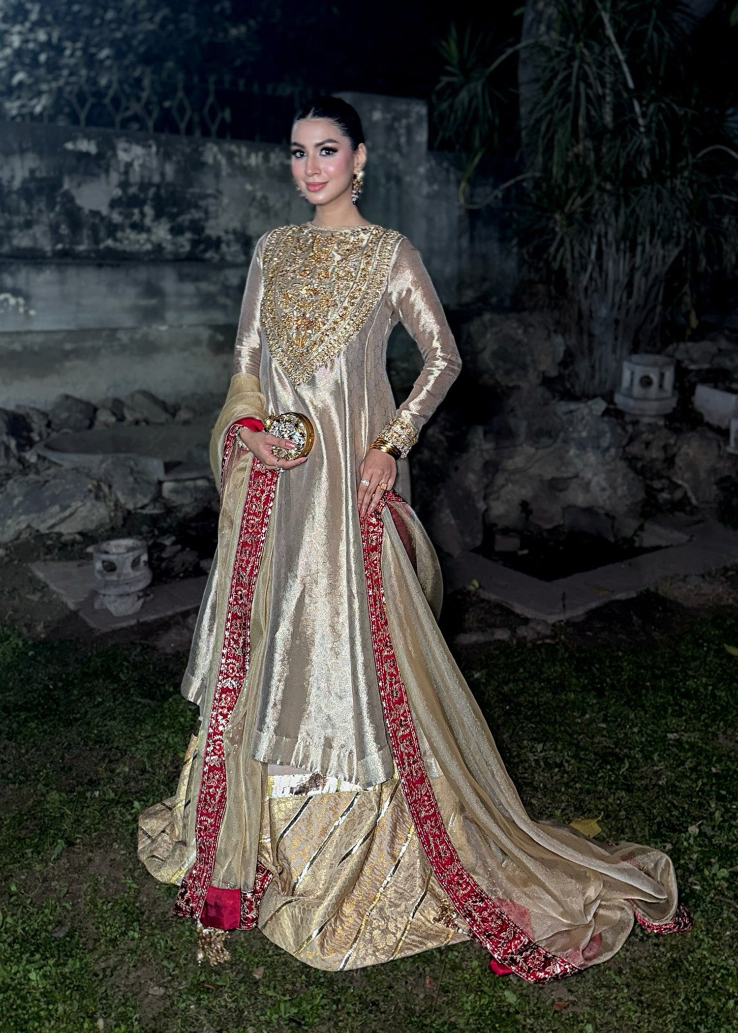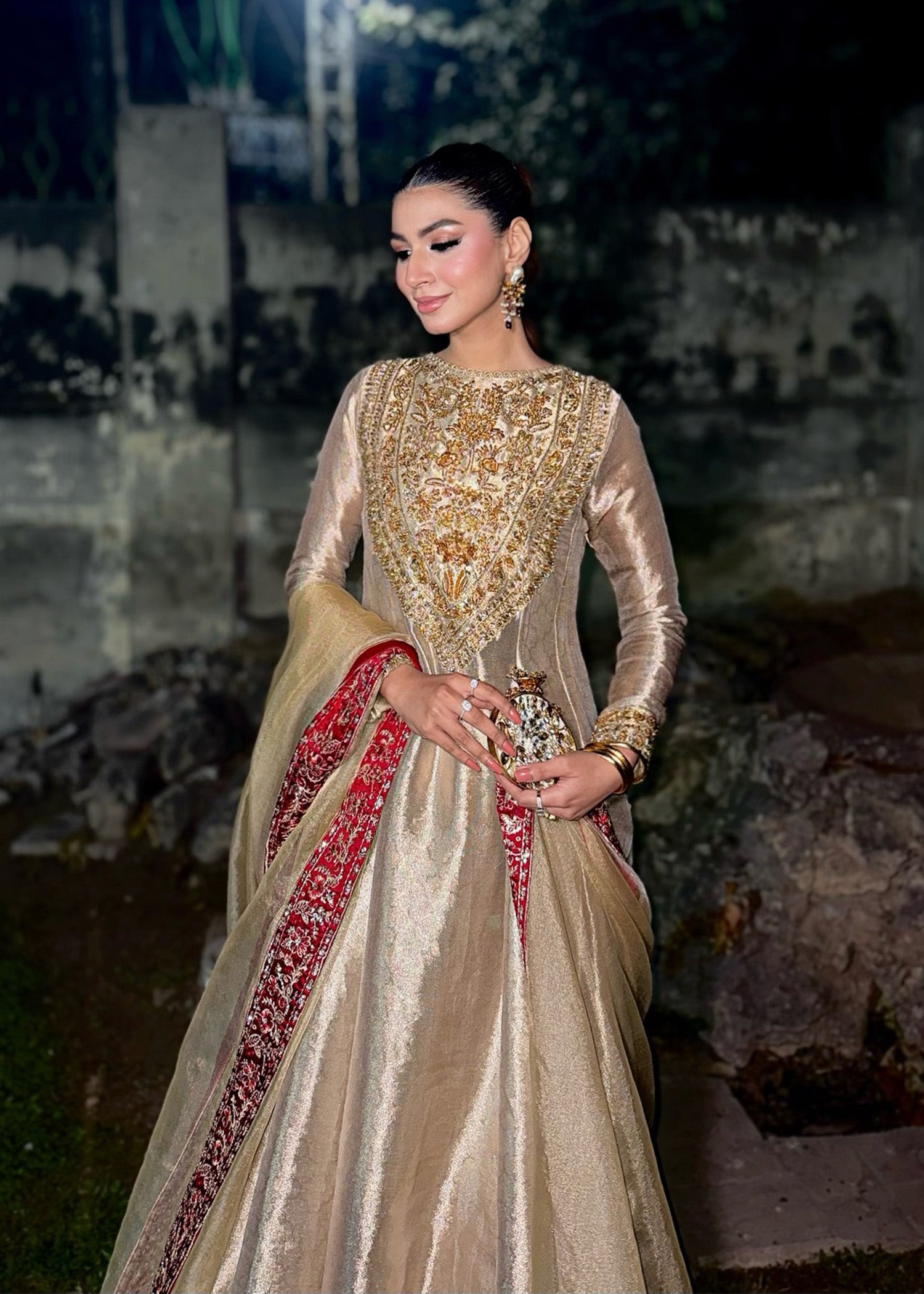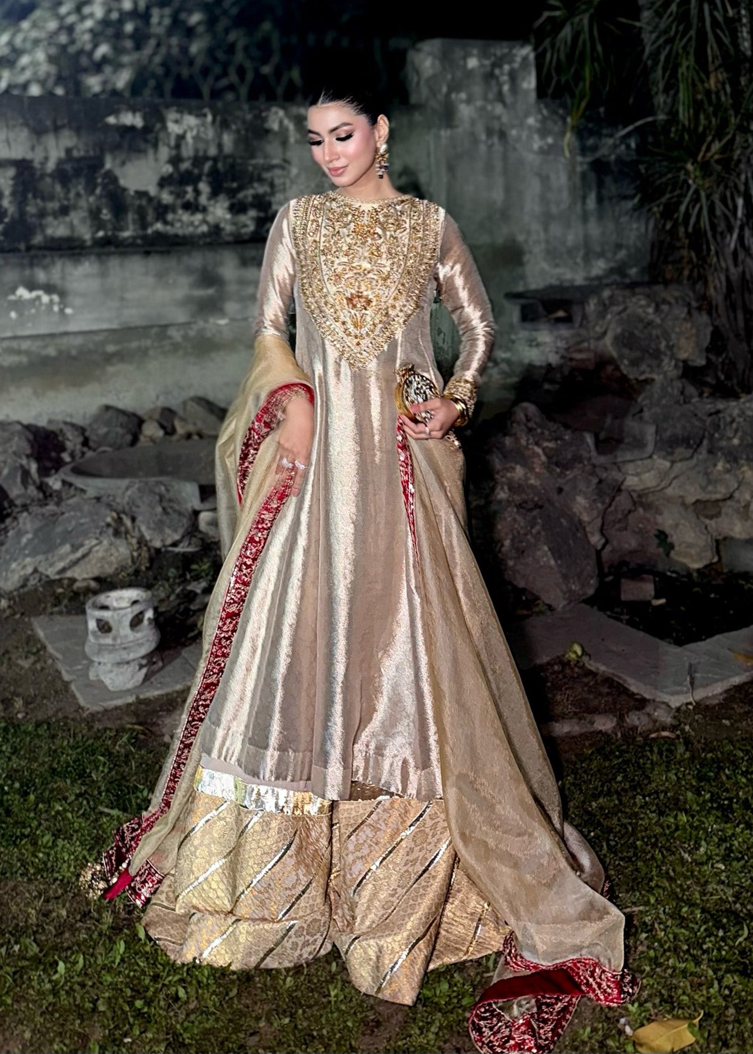 Offering elevated ease and sophistication, this gold tissue panelled peshwas features a heavily worked neckline and a classic chatta patti brocade sharara. Completing the festive look with a gold pure net dupatta framed with a red charmeuse silk border, you can totally style this for an intimate nikkah or bookmark it for the trousseau.