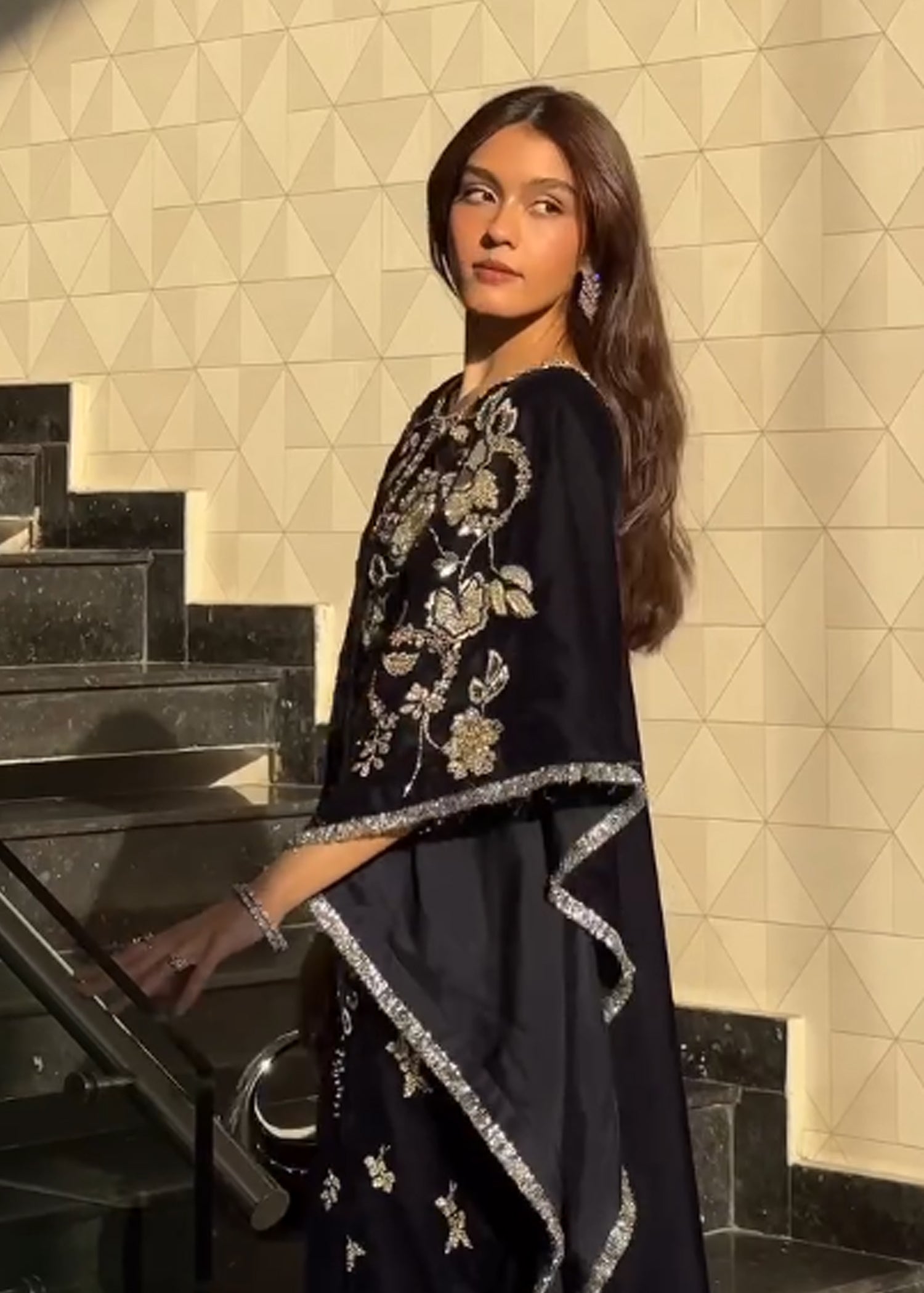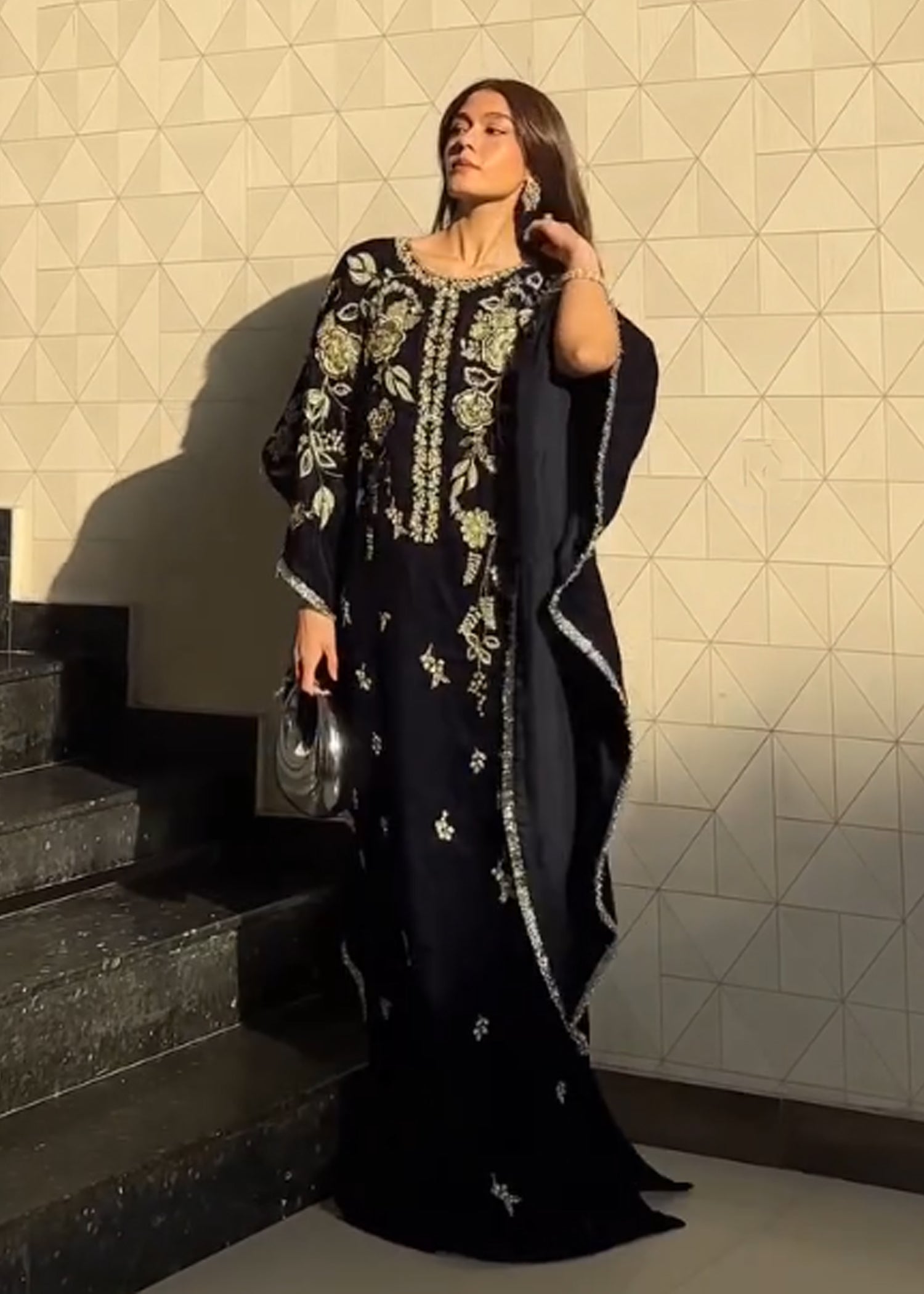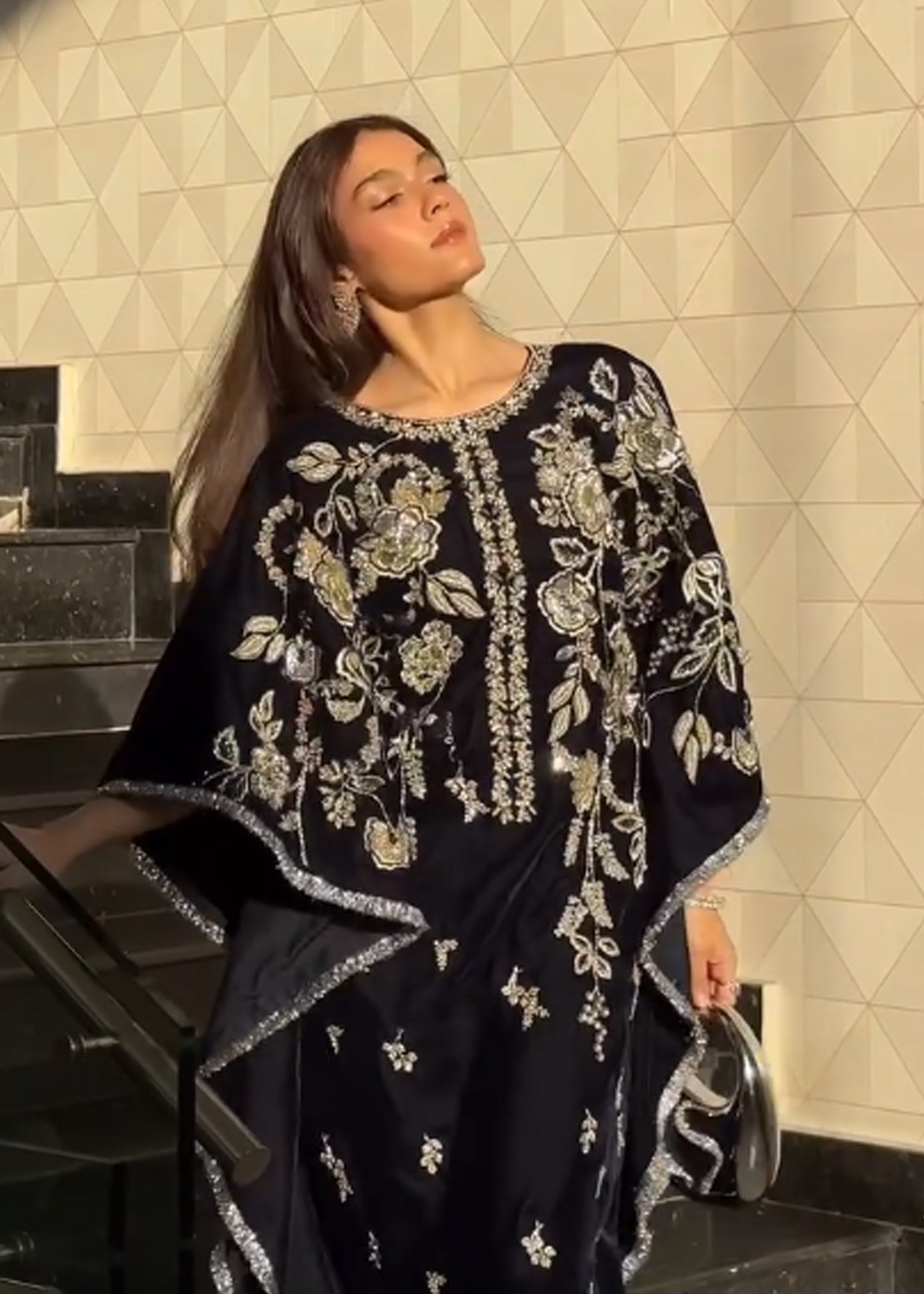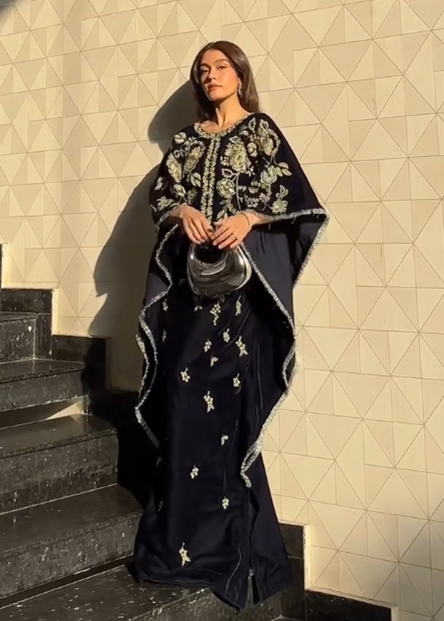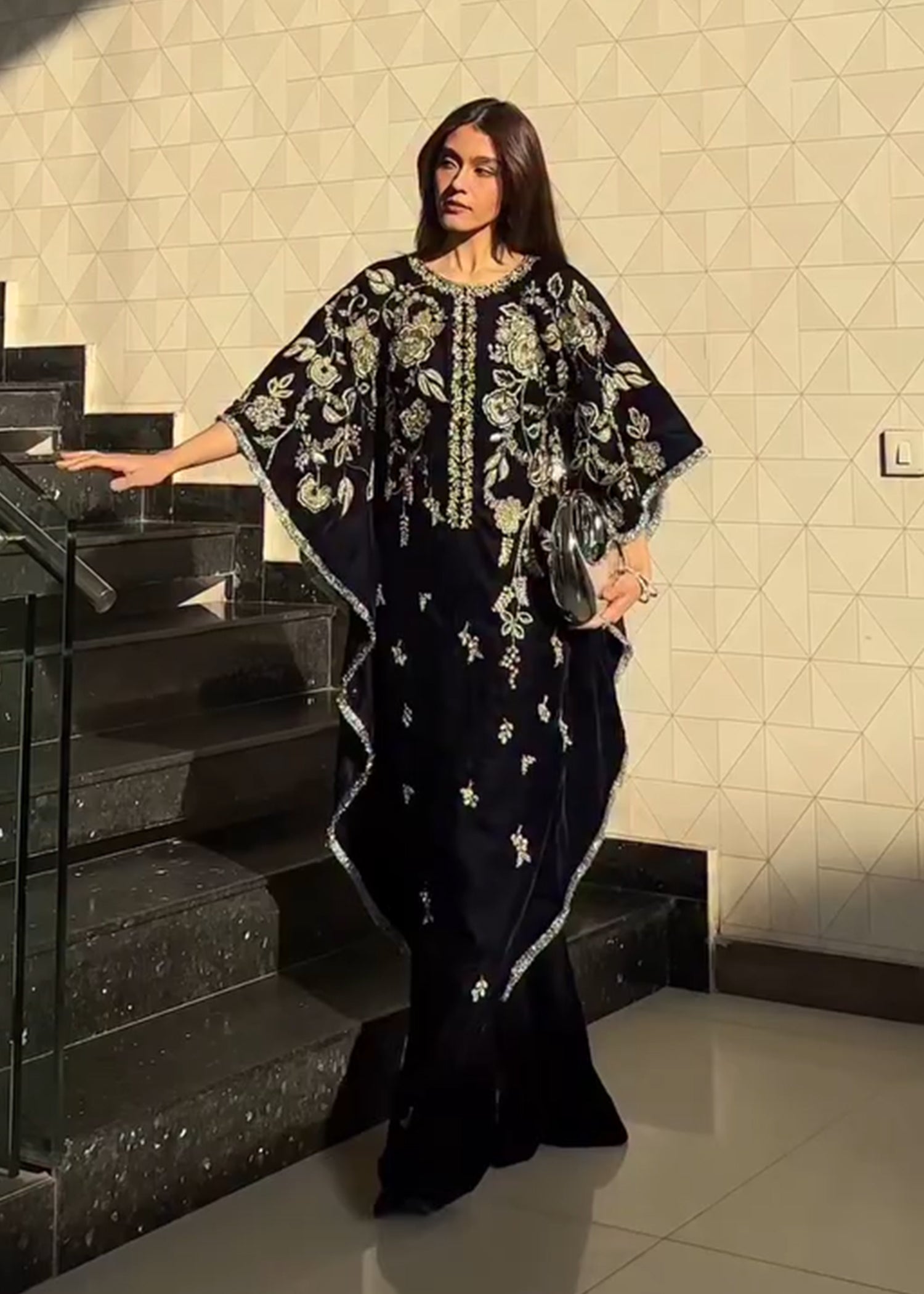 Hand worked velvet kaftan with batwing effect sleeve shape and a decorative Kiran finishing to offer a perfect blend of classic and contemporary.