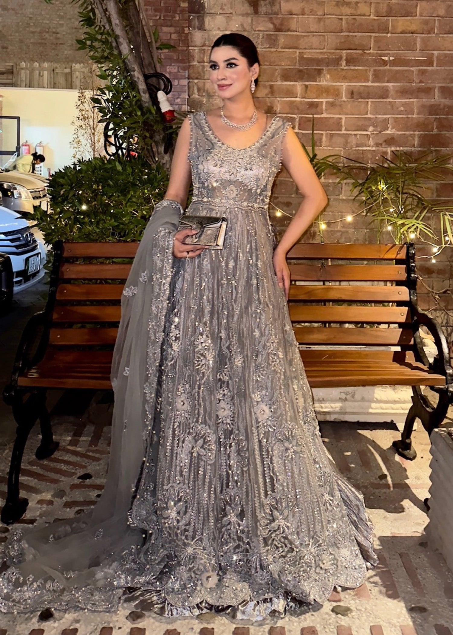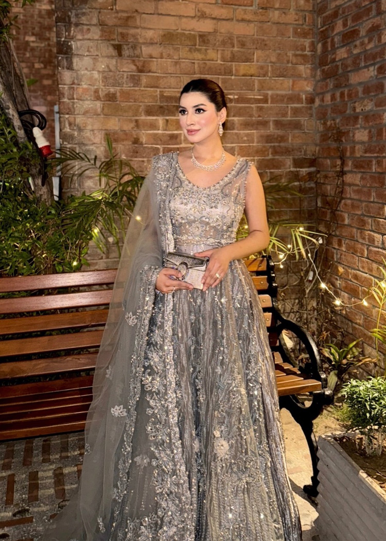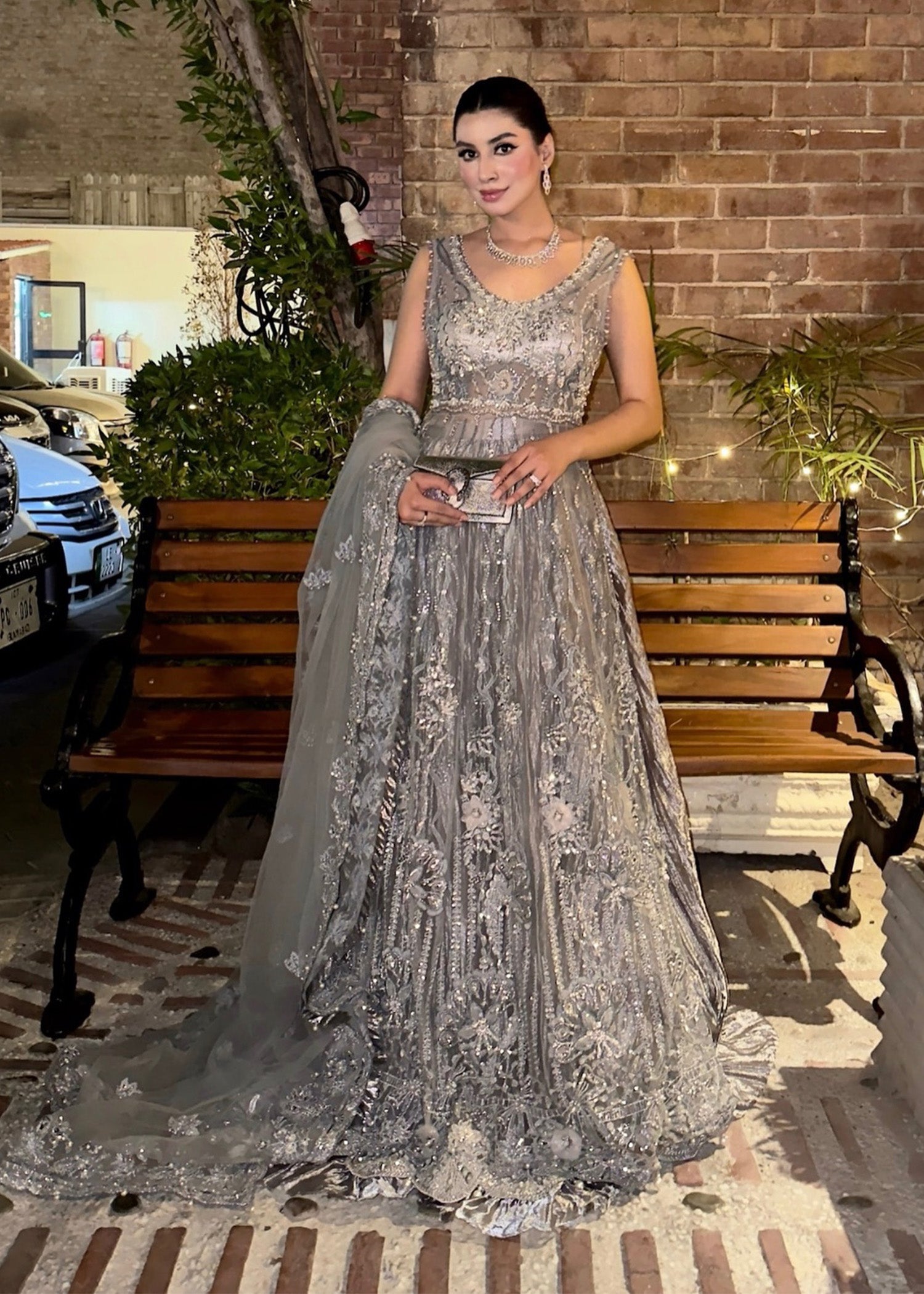 A Smokey grey net formal long shirt with a crushed tissue sharara. The shirt is finely embellished by hand and paired with a heavy net dupatta to match. Paired with a voluminous crushed silver grey sharara .