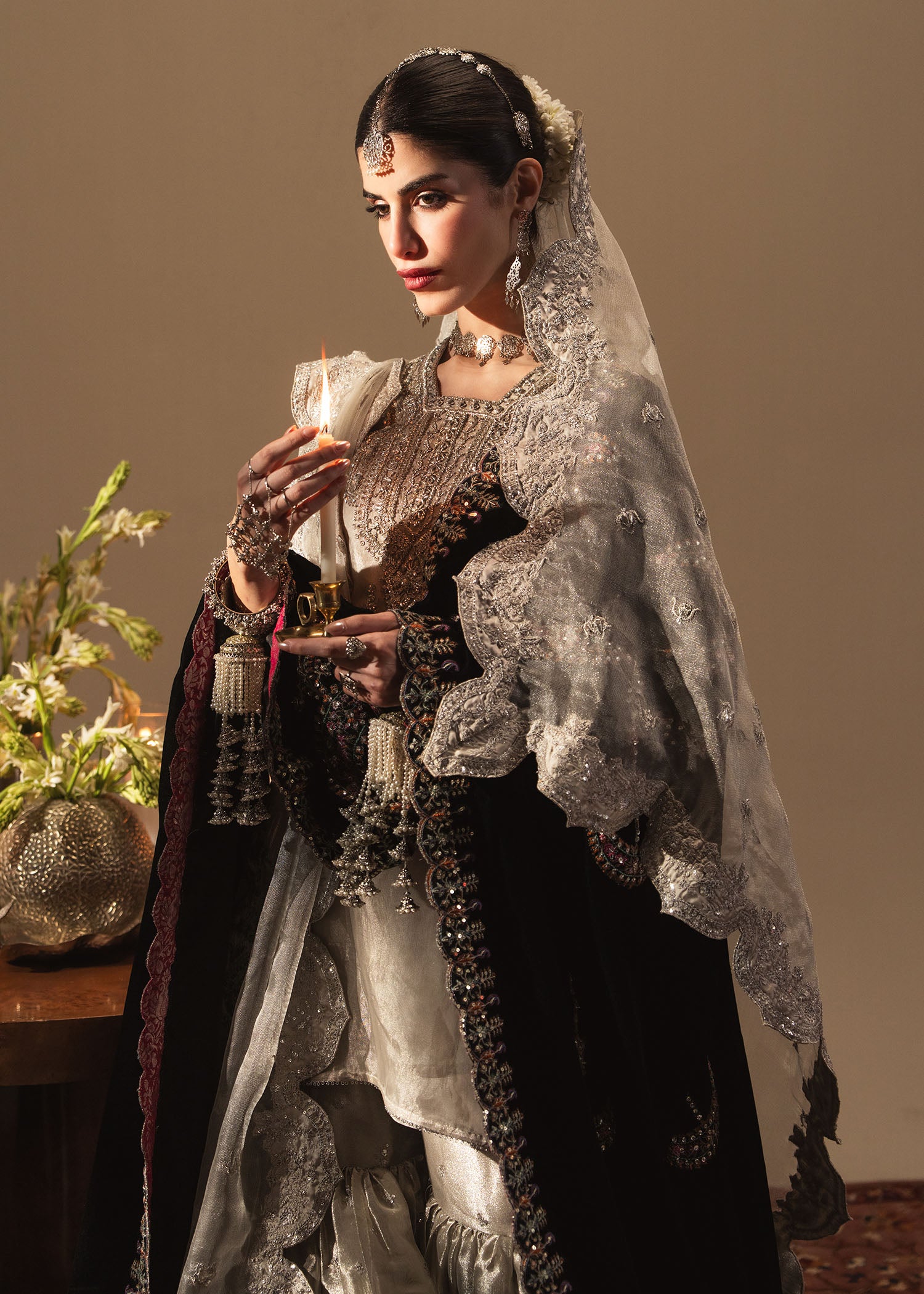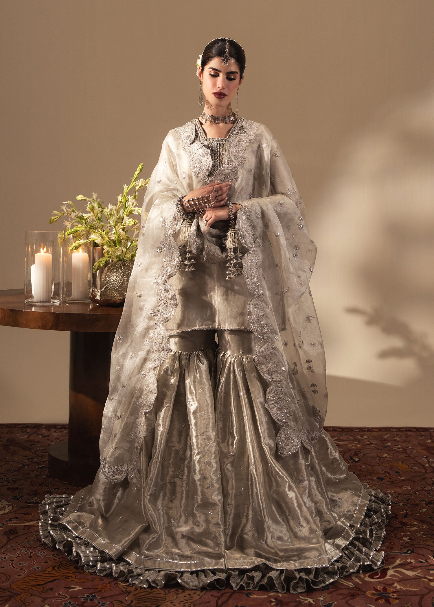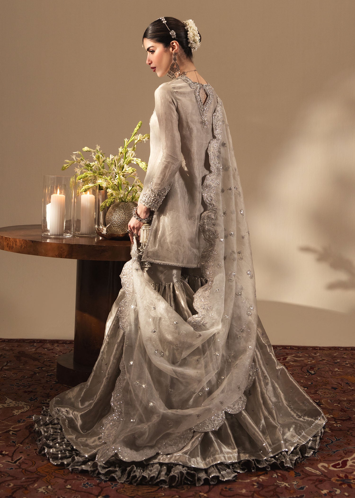 A silver gharara set with a delicately handworked shirt and dupatta in zari net.