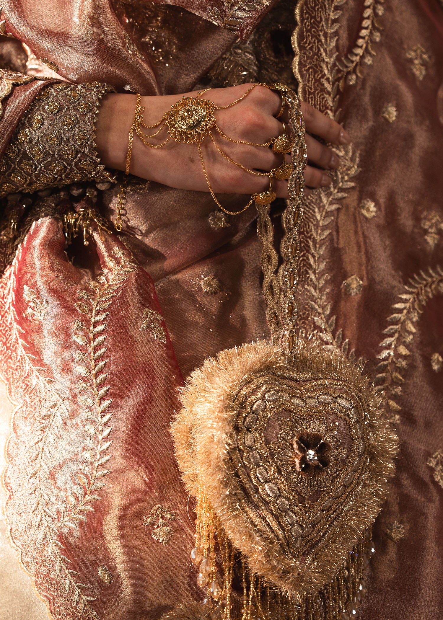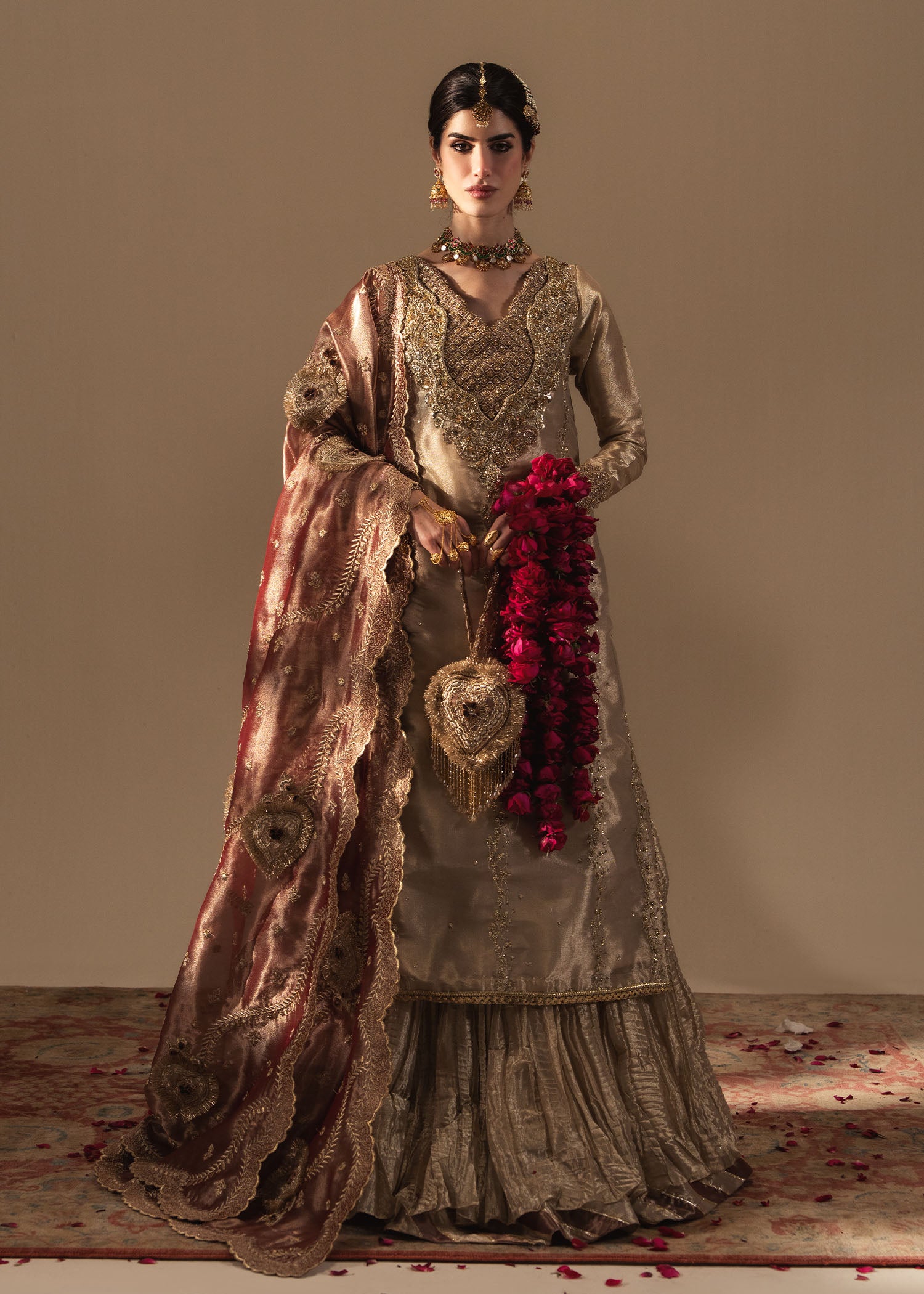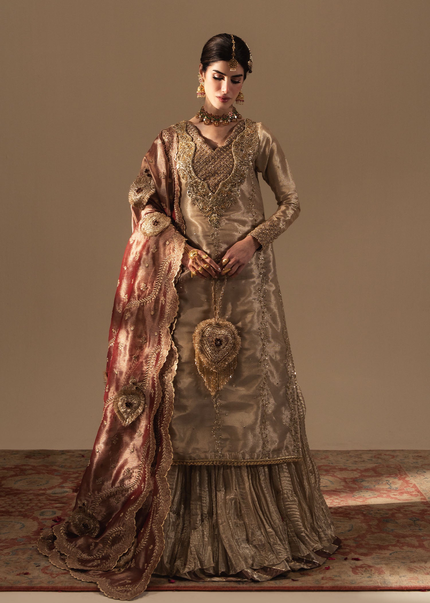 Paired with a crushed matching sharara and a coral toned gorgeous dupatta crafted with heart shaped motifs in embroidery and Kiran based embellished techniques to add that regal old school charm.