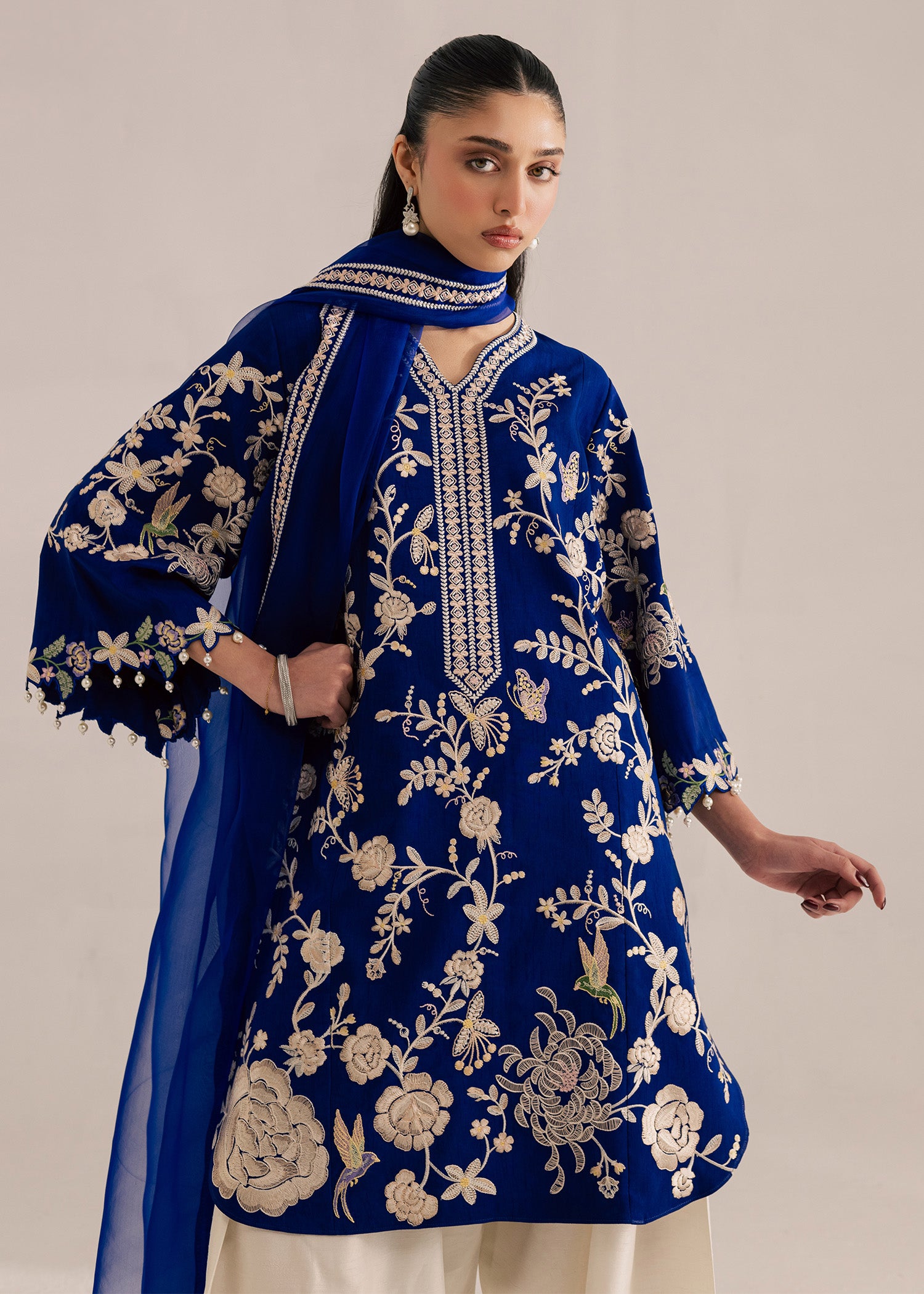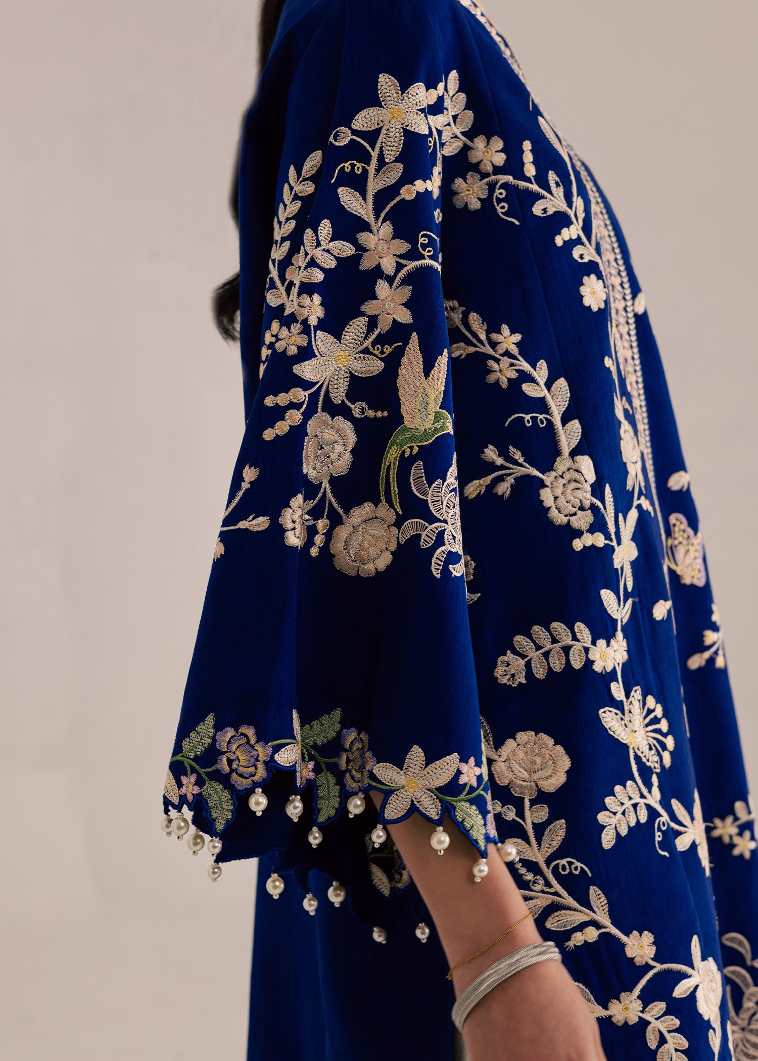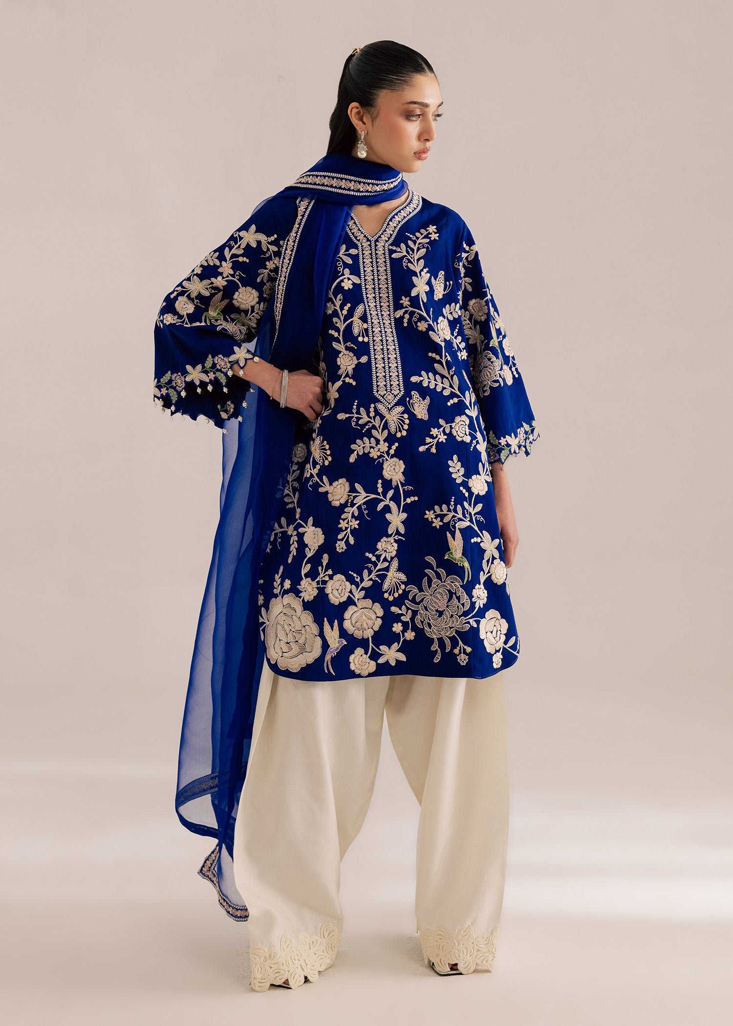 An embroidered cobalt kurta with a rounded silhouette, paired with a farshi shalwar—heritage reimagined for now.