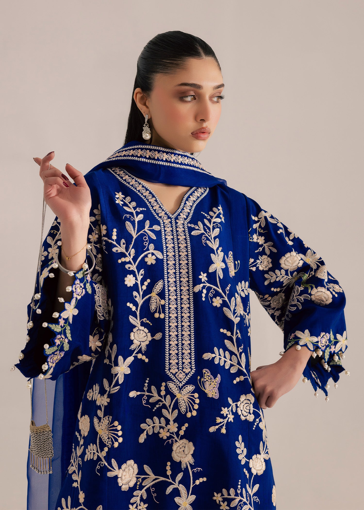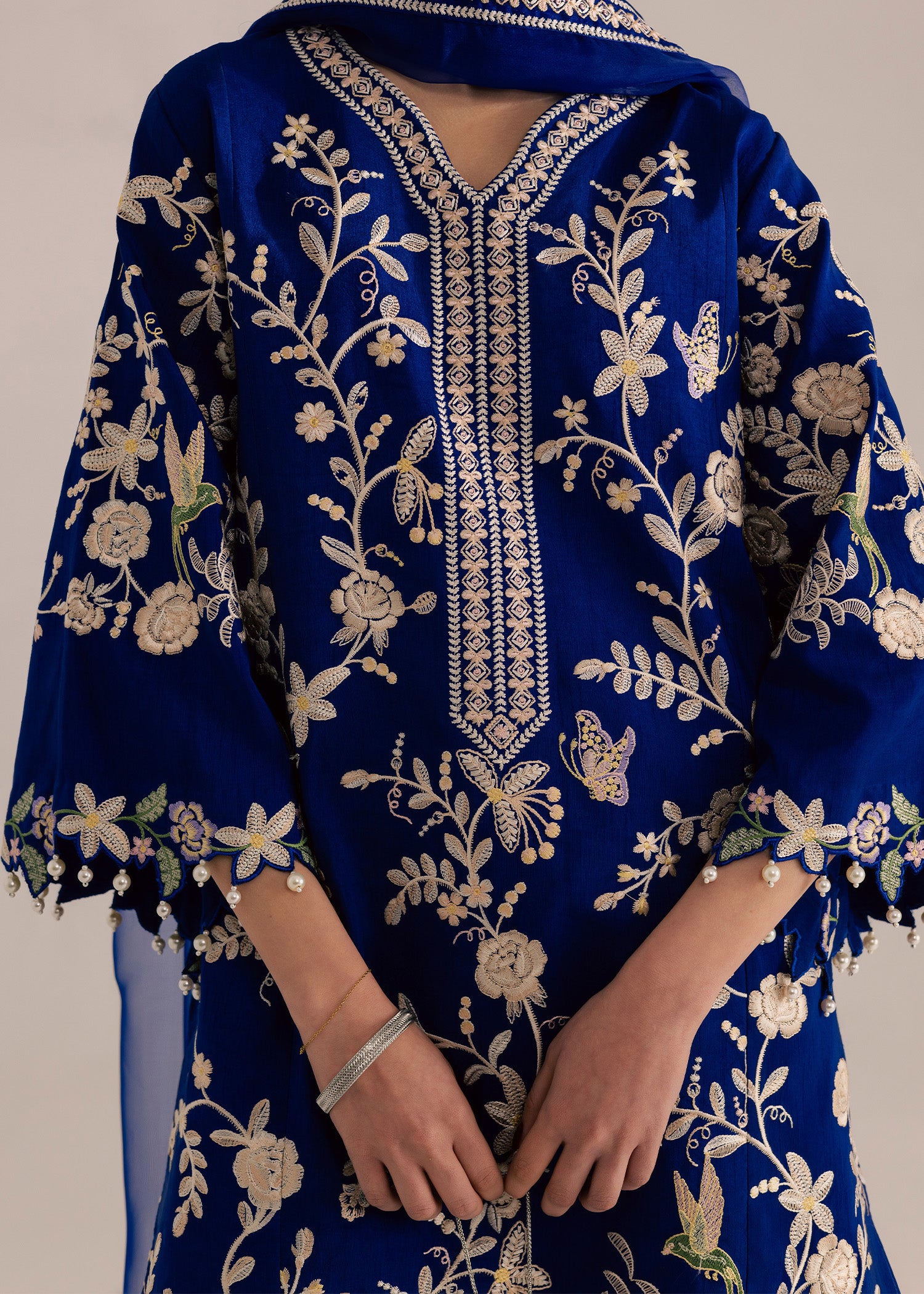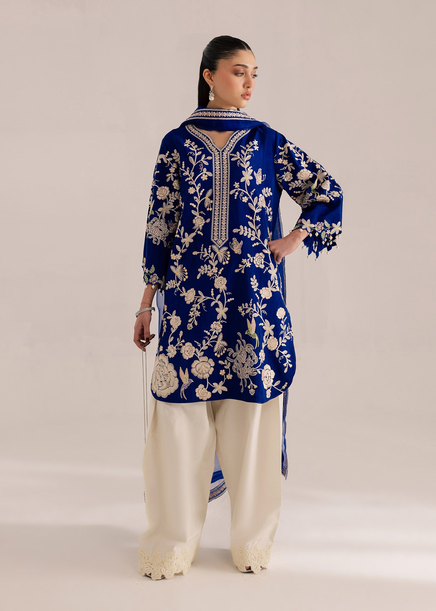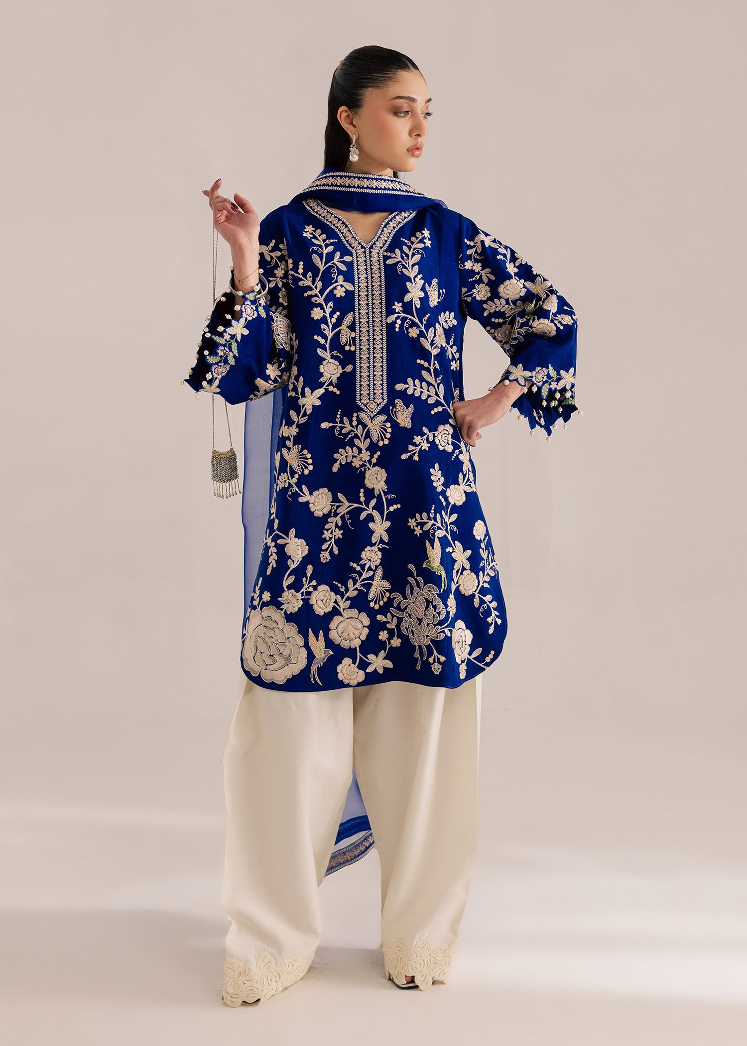 An embroidered cobalt kurta with a rounded silhouette, paired with a farshi shalwar—heritage reimagined for now.
