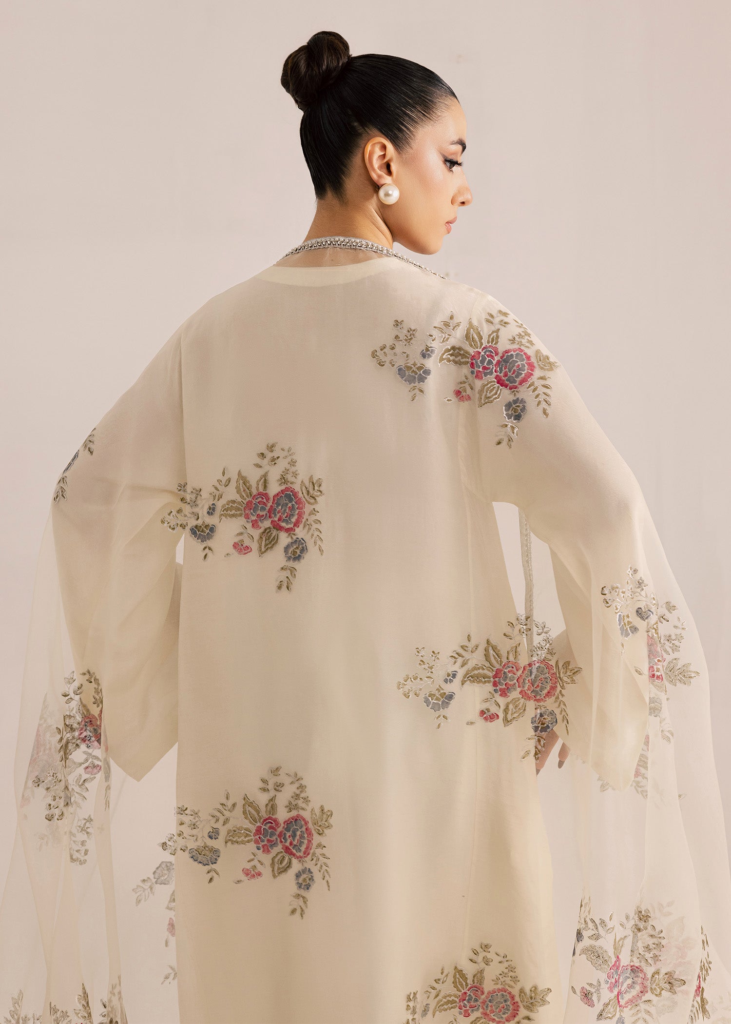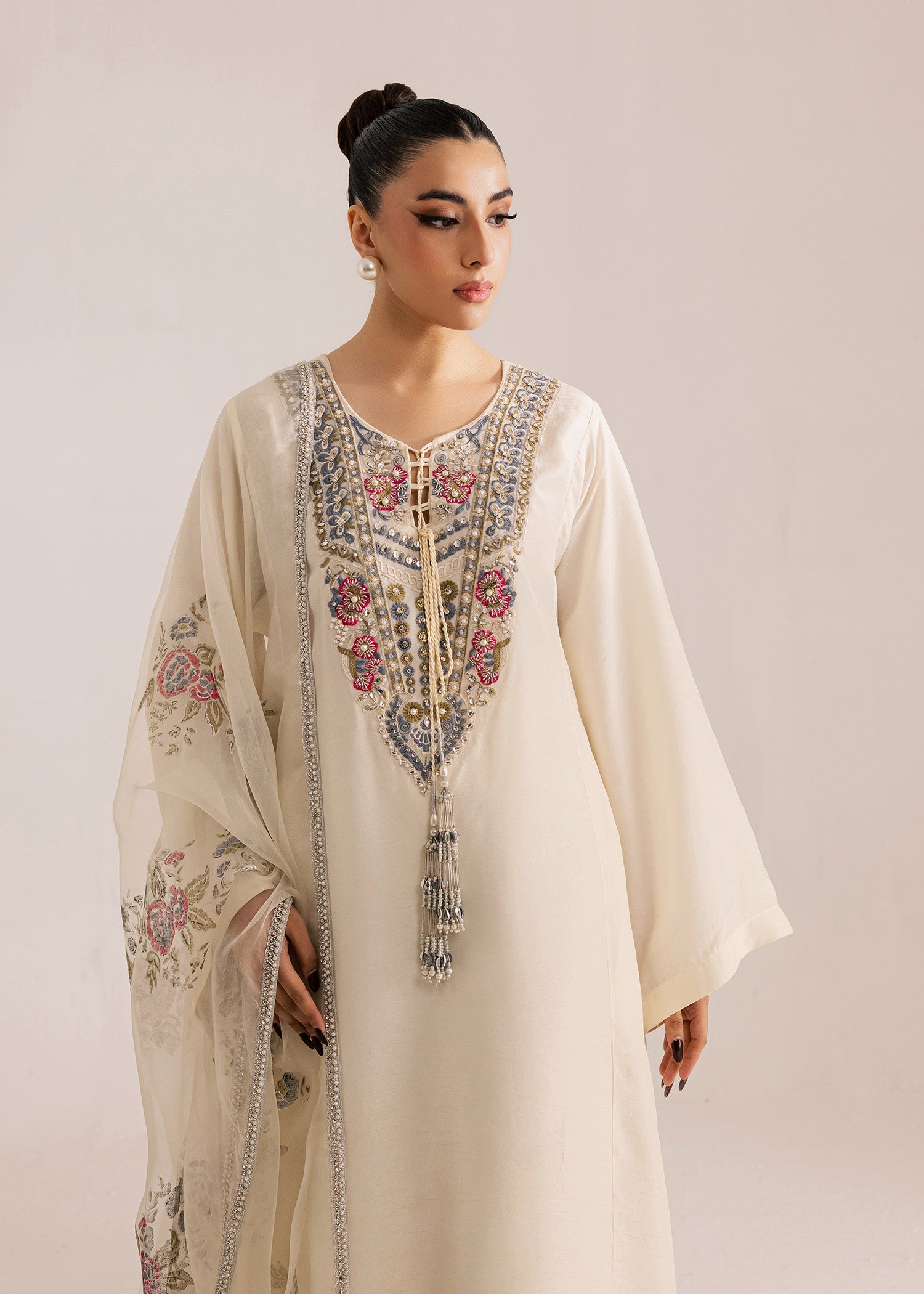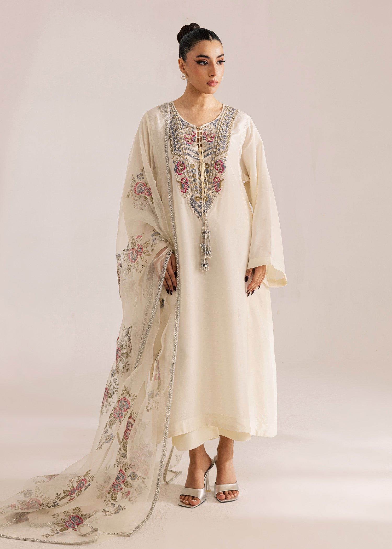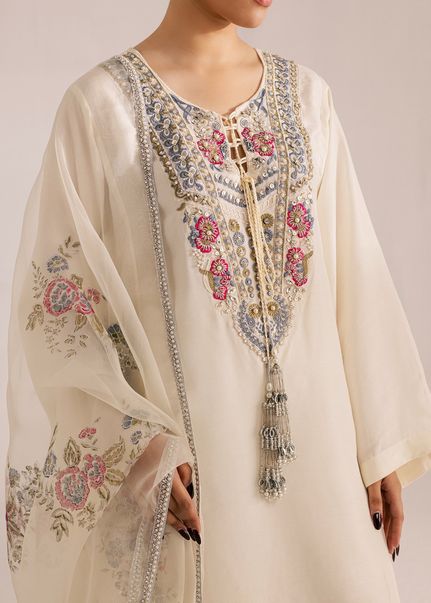 Fluid Korean rawsilk ivory kurta with hand embellished neckline and chunky handmade neck tassles. Paired with matching pants and floral printed organza dupatta.