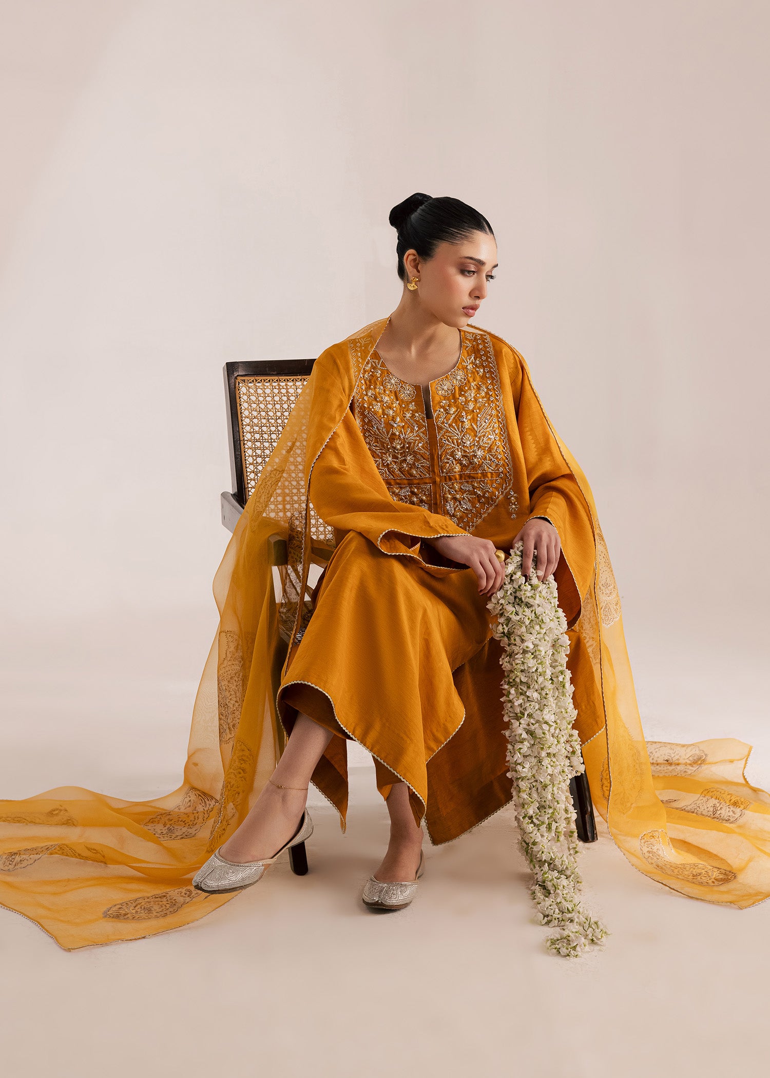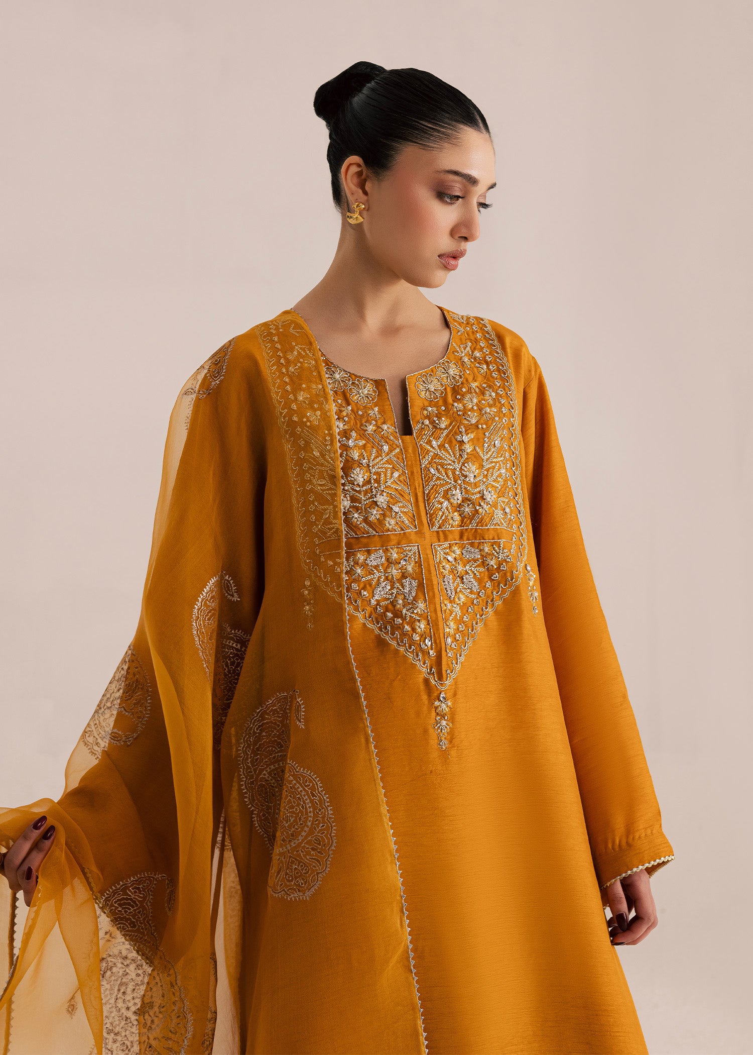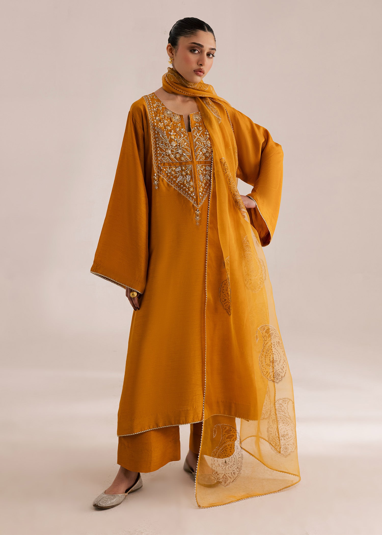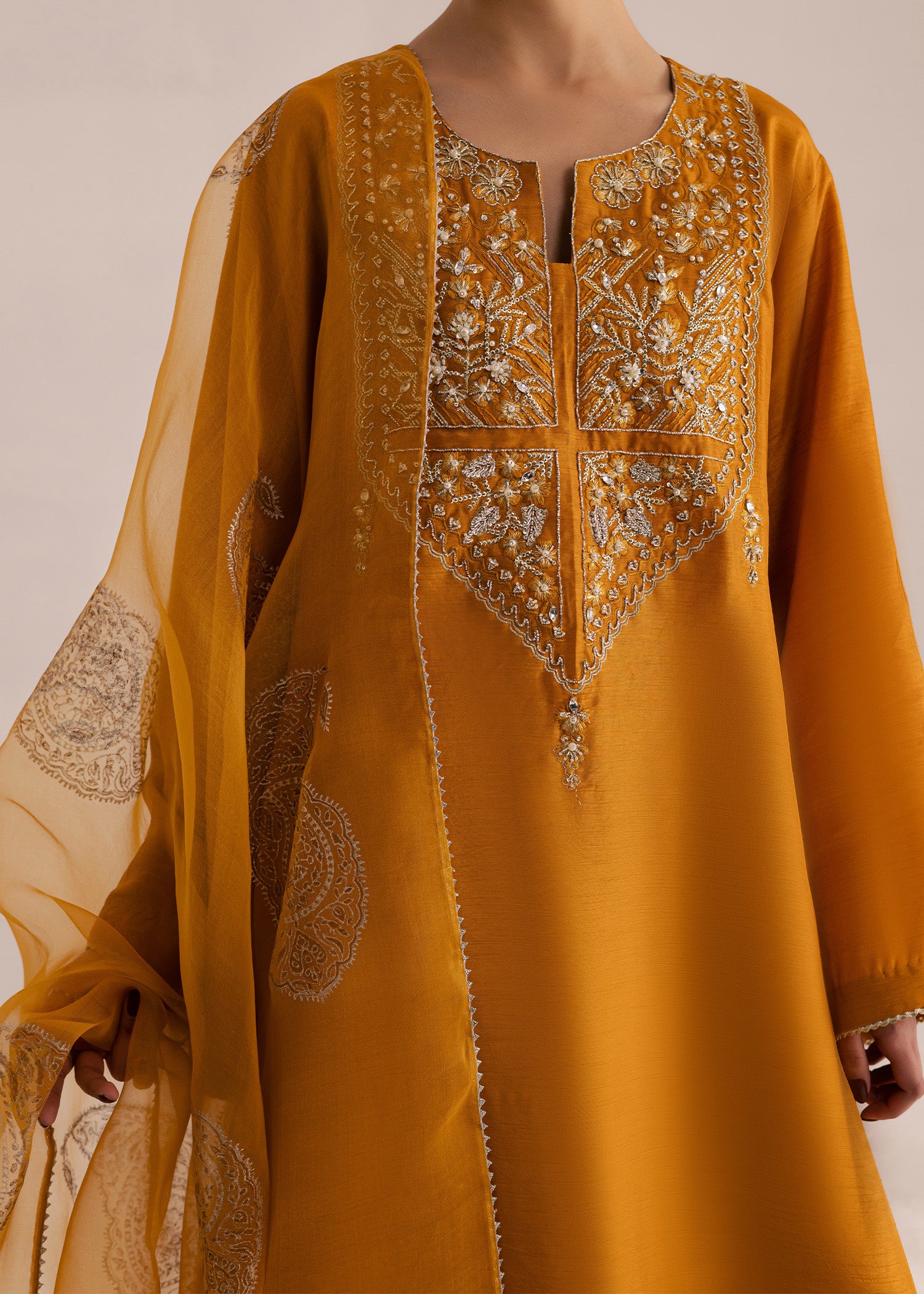 Loose cut mustard silk kurta with a delicately hand embellished yoke and a paisley printed organza dupatta.
