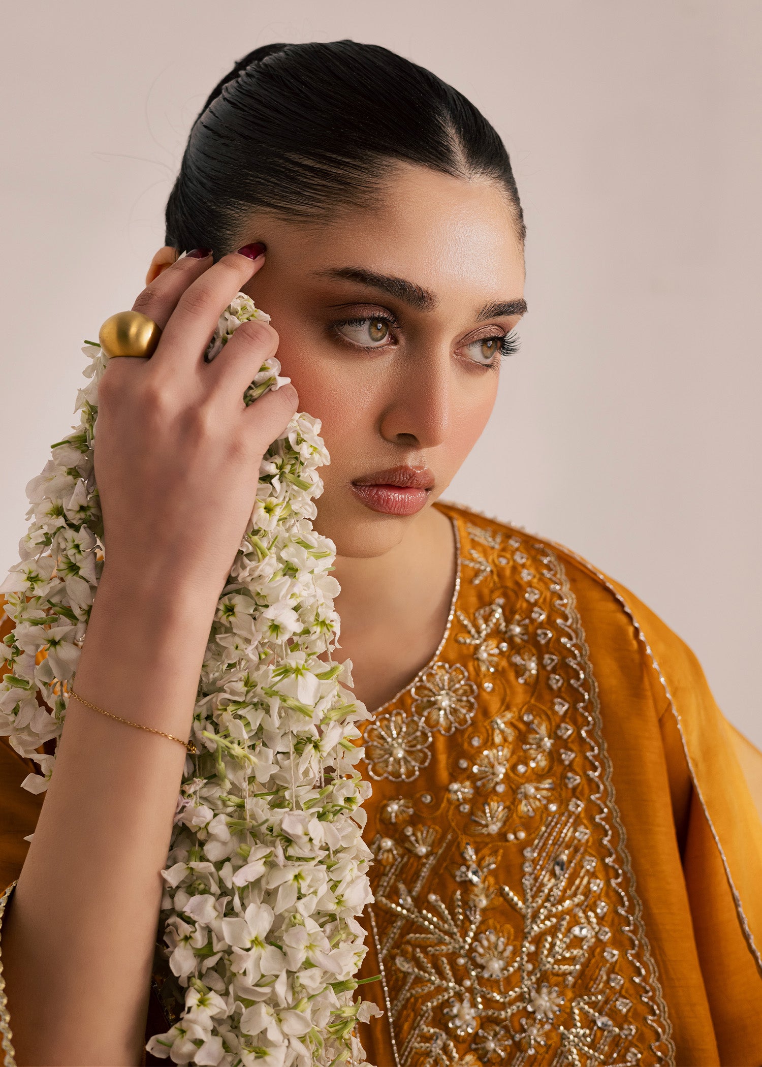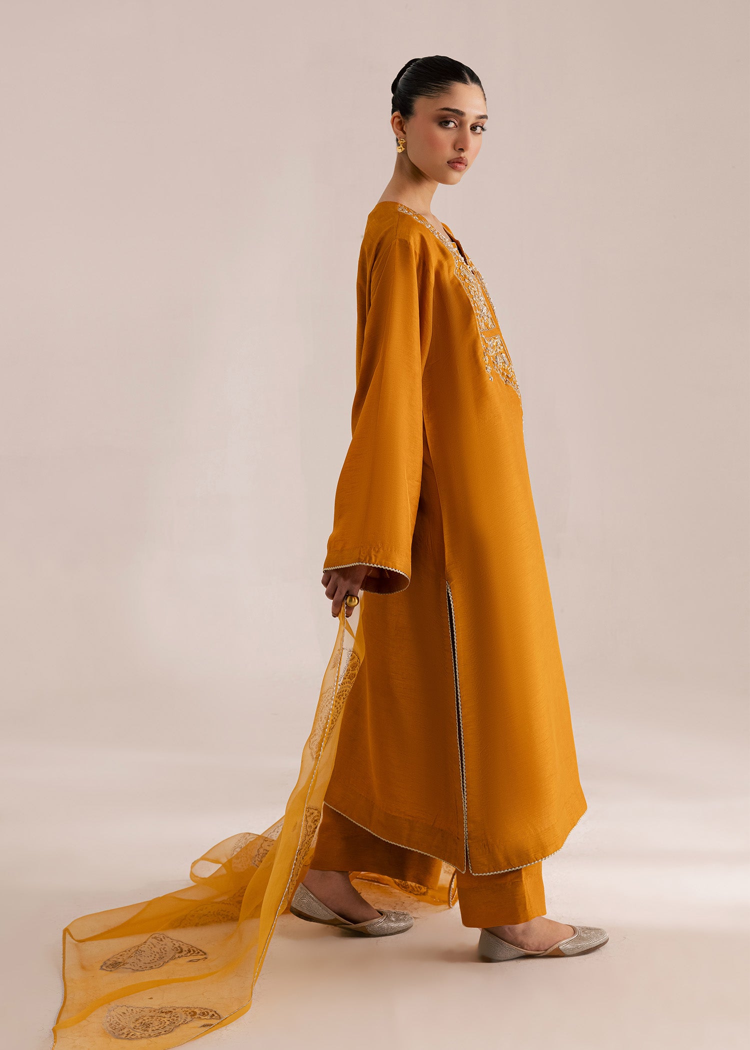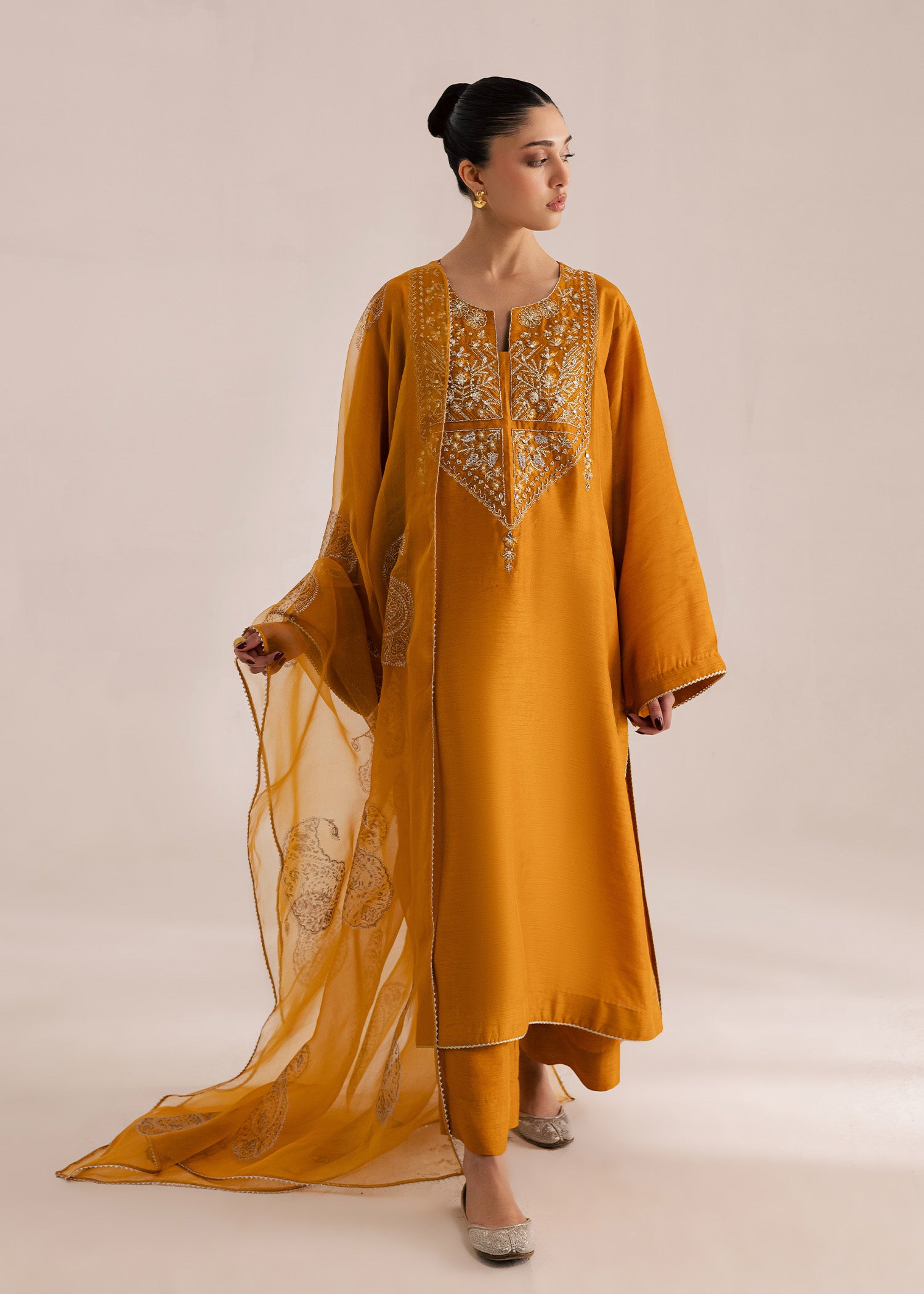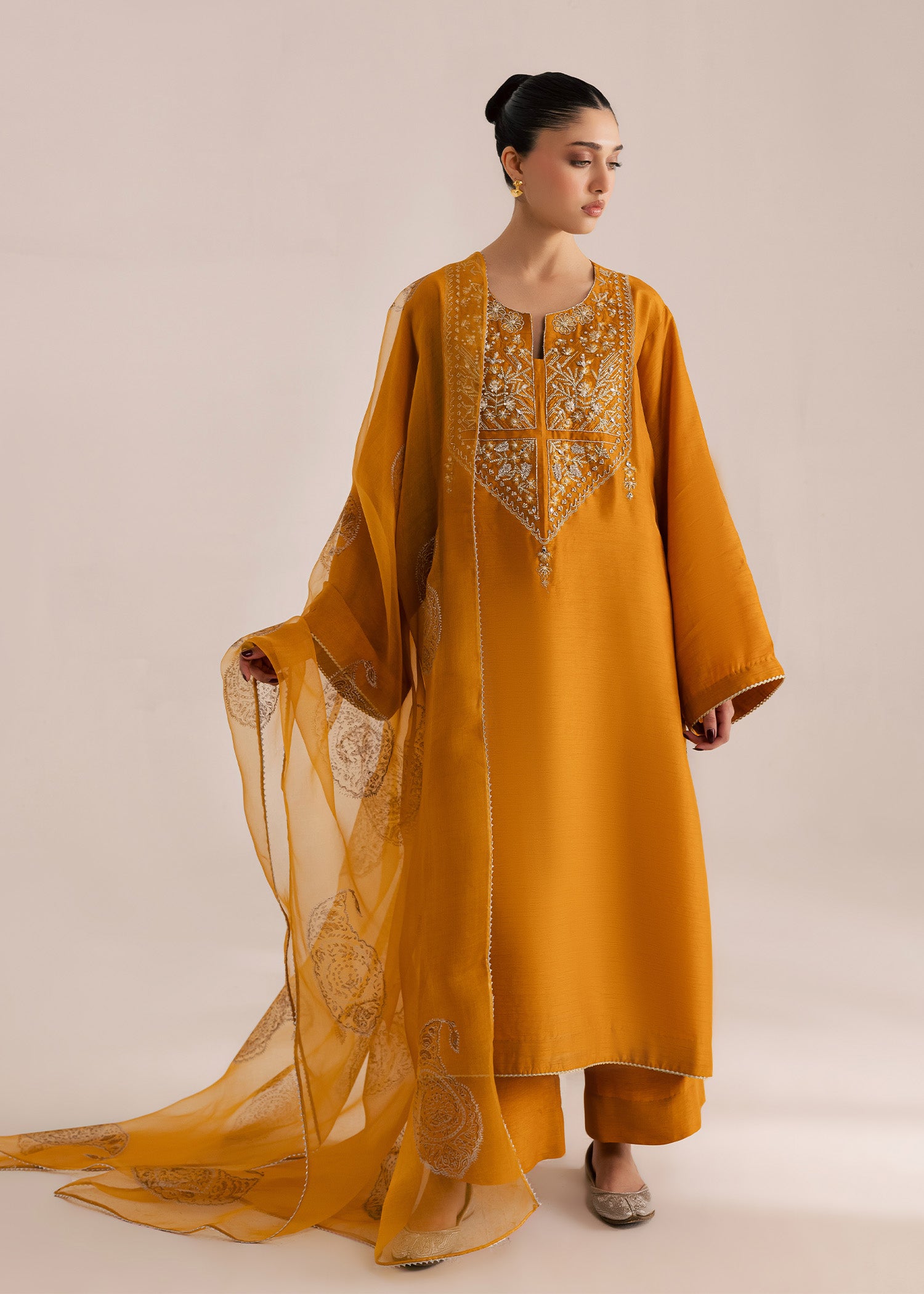 Loose cut mustard silk kurta with a delicately hand embellished yoke and a paisley printed organza dupatta.