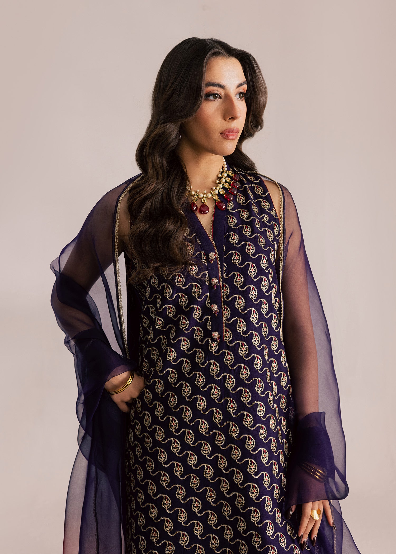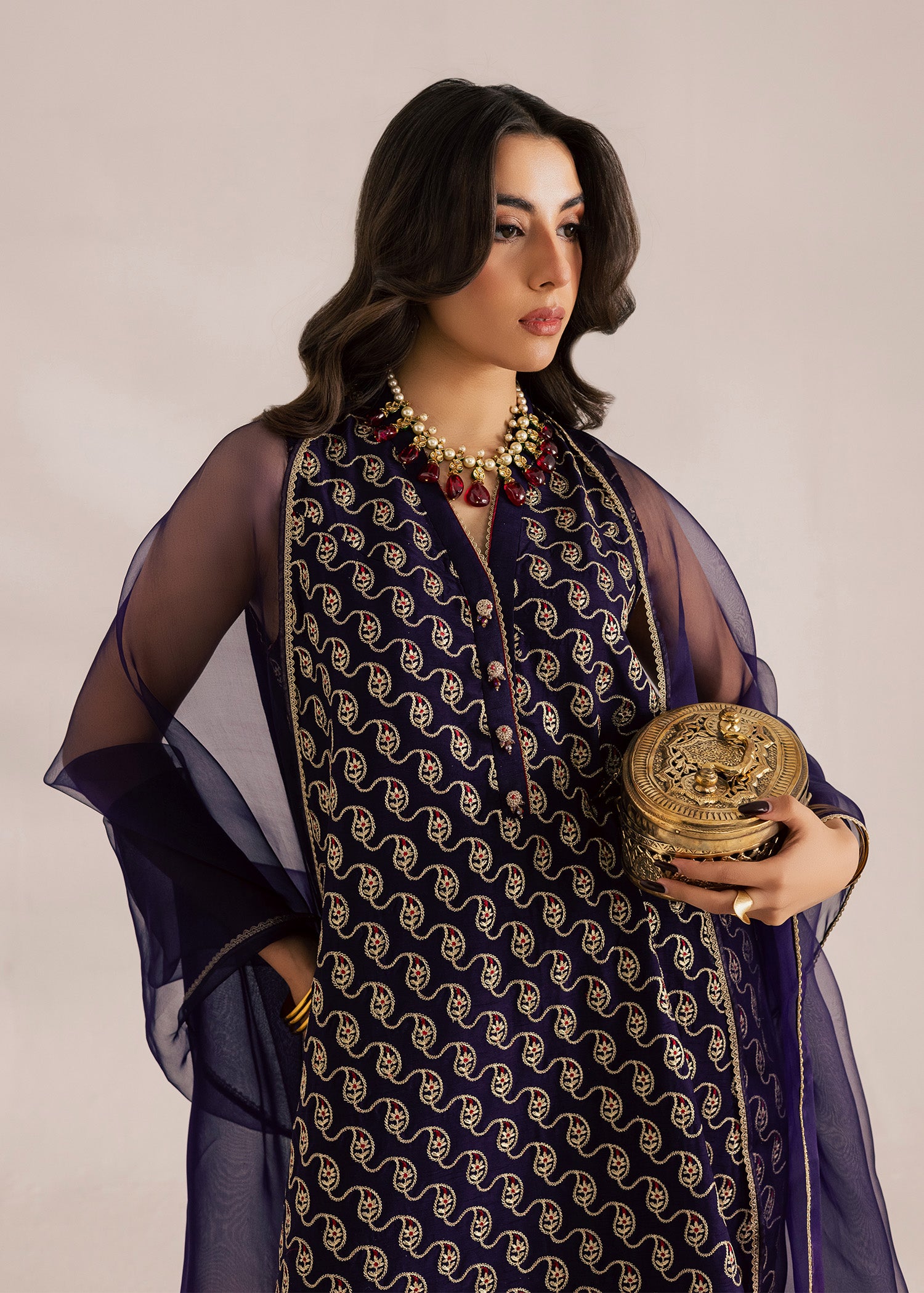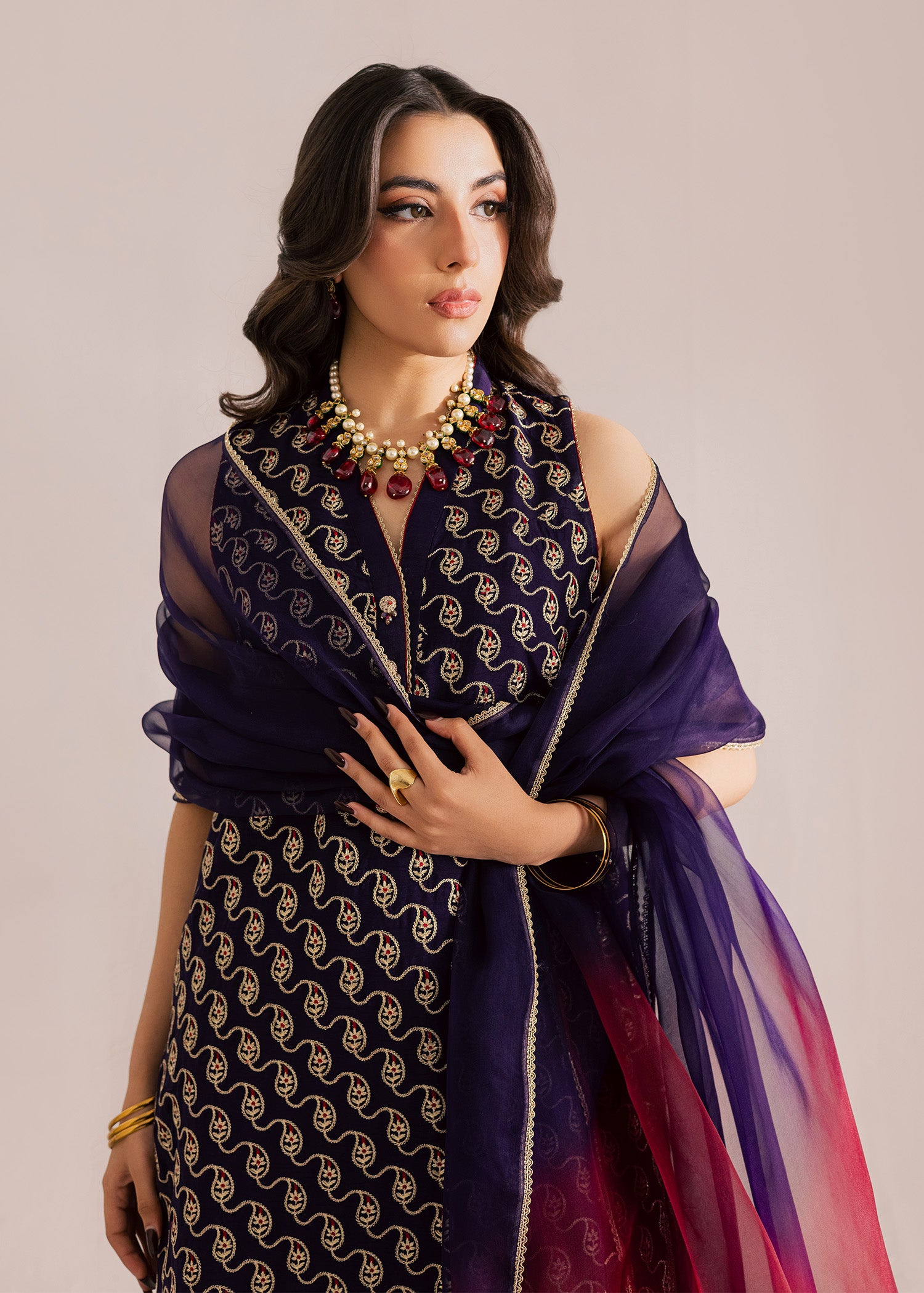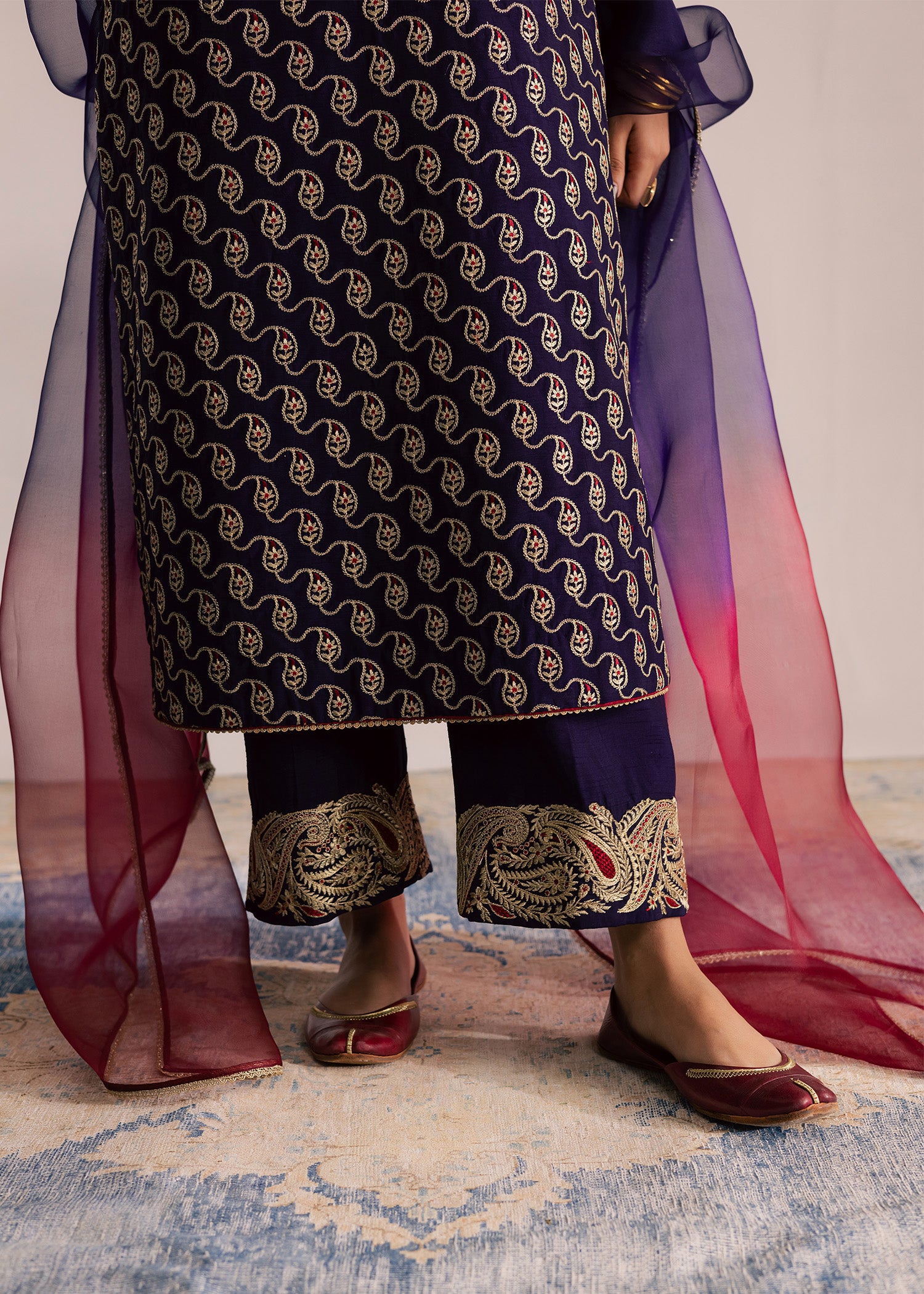 Purple long length silk kurta detailed with ari work in gold tila and maroon resham. Subtly lifted with hand crafted buttons and a dip dyed organza dupatta.