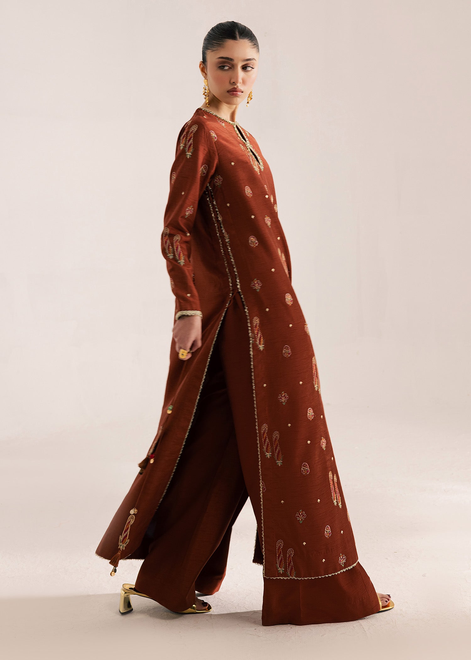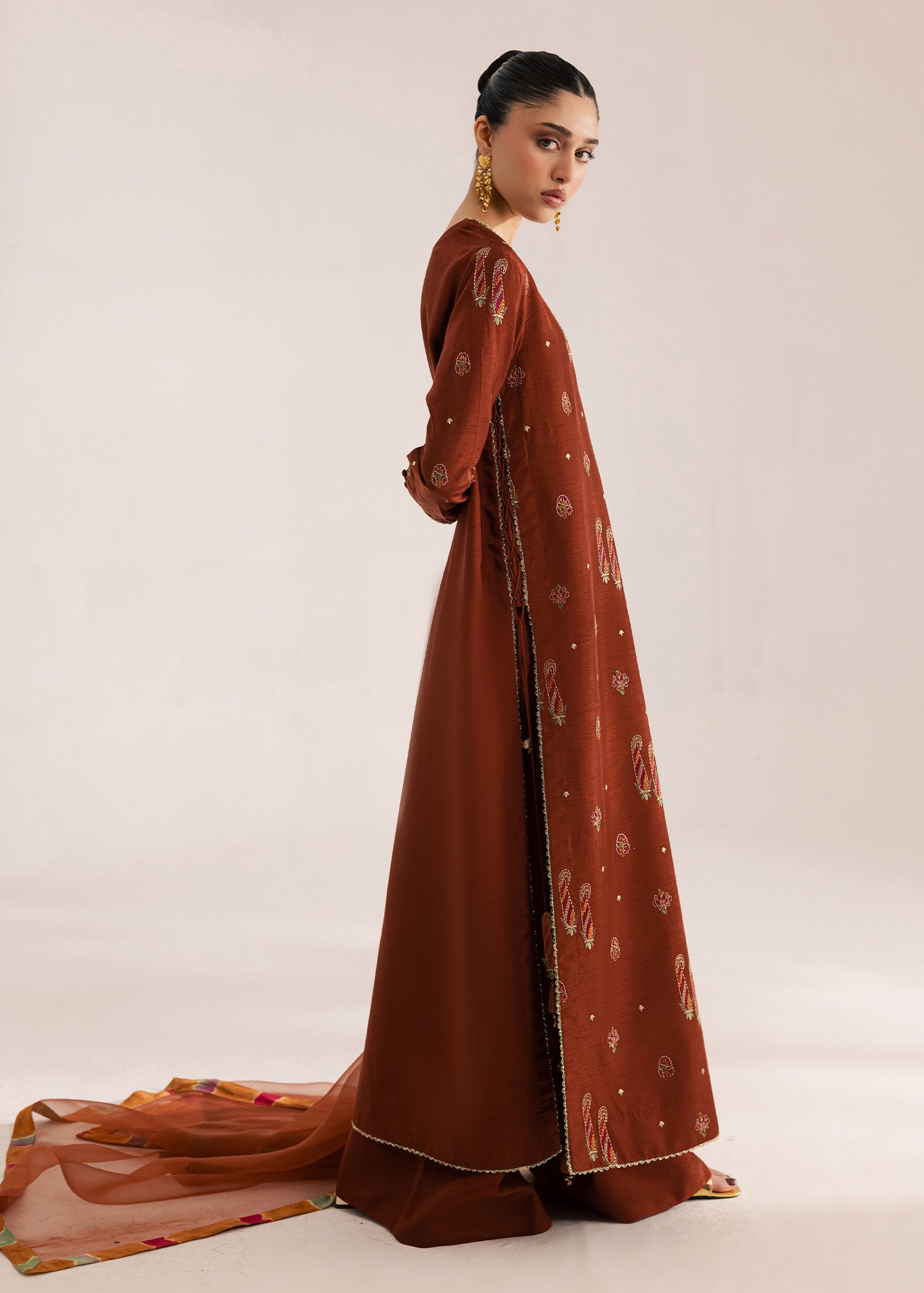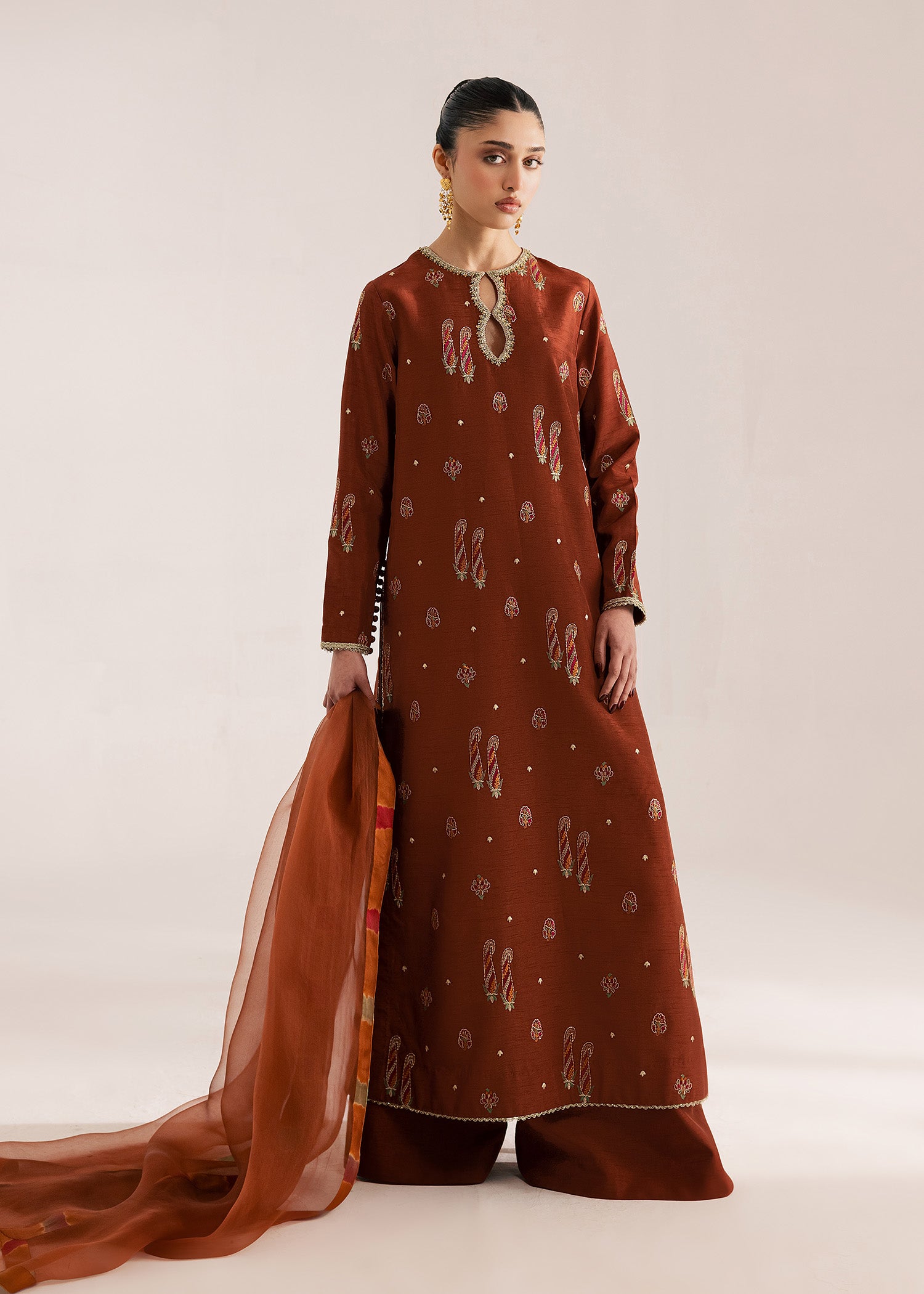 Deep terracotta silk long length embroidered kurta with modern side slits detailed with hand made tassling and delicate gold lace edging. Paired with a wide leg trouser and an organza dupatta finished with a multi colored tie-die finishing detail.