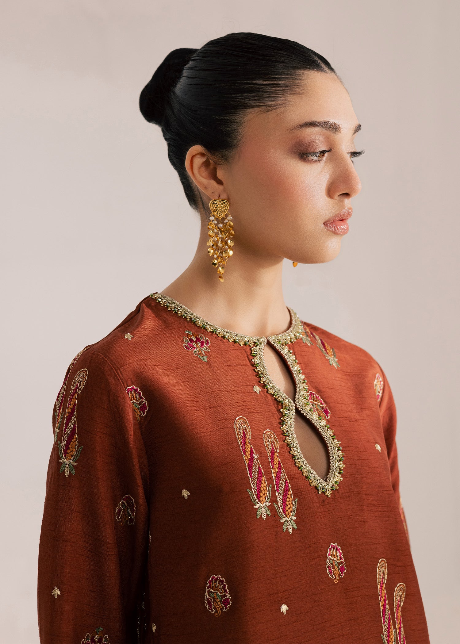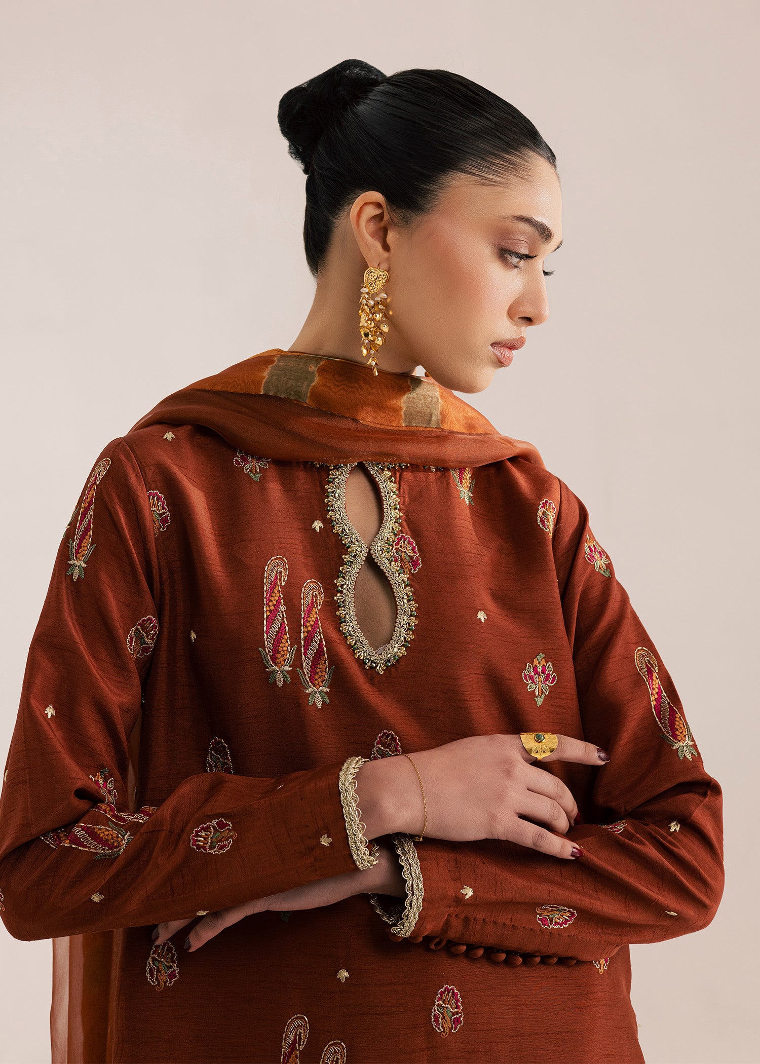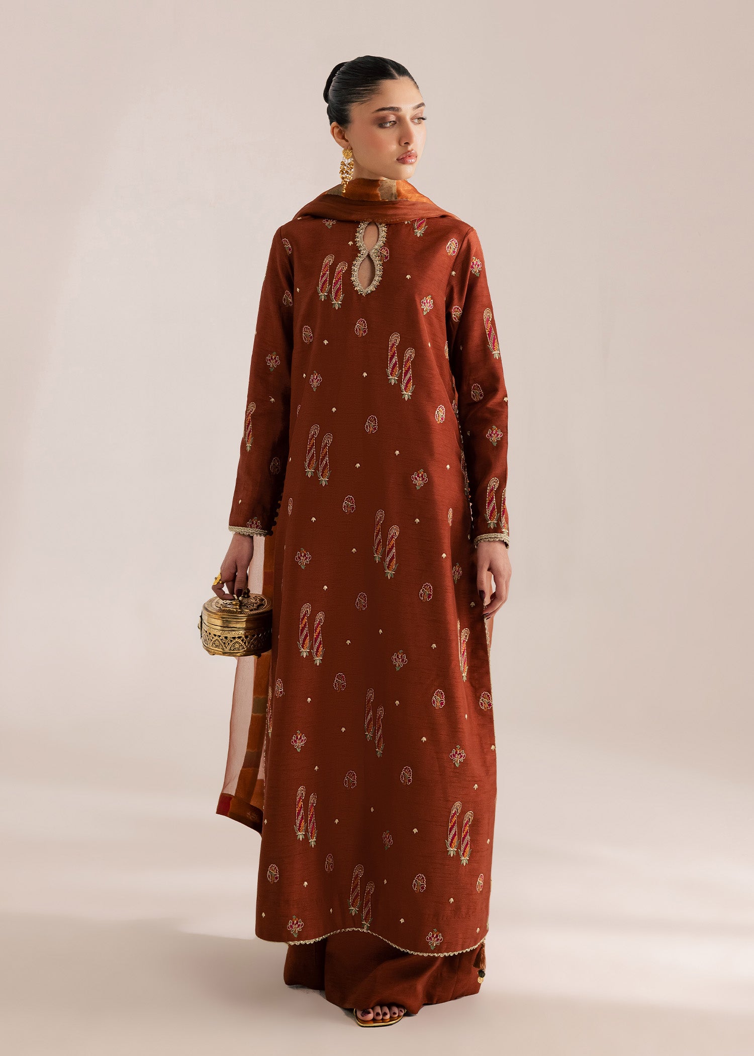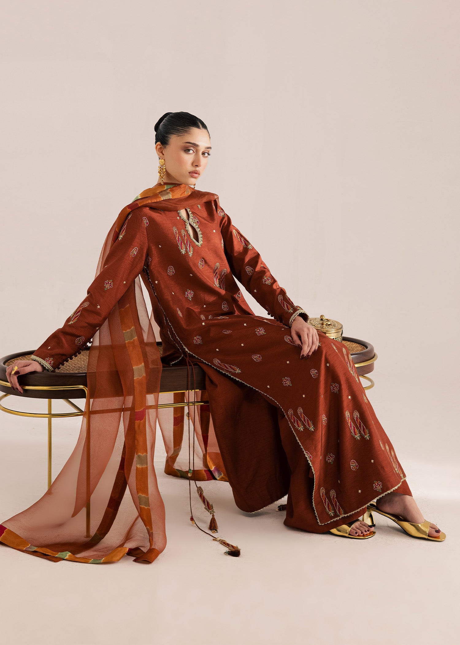 Deep terracotta silk long length embroidered kurta with modern side slits detailed with hand made tassling and delicate gold lace edging. Paired with a wide leg trouser and an organza dupatta finished with a multi colored tie-die finishing detail.