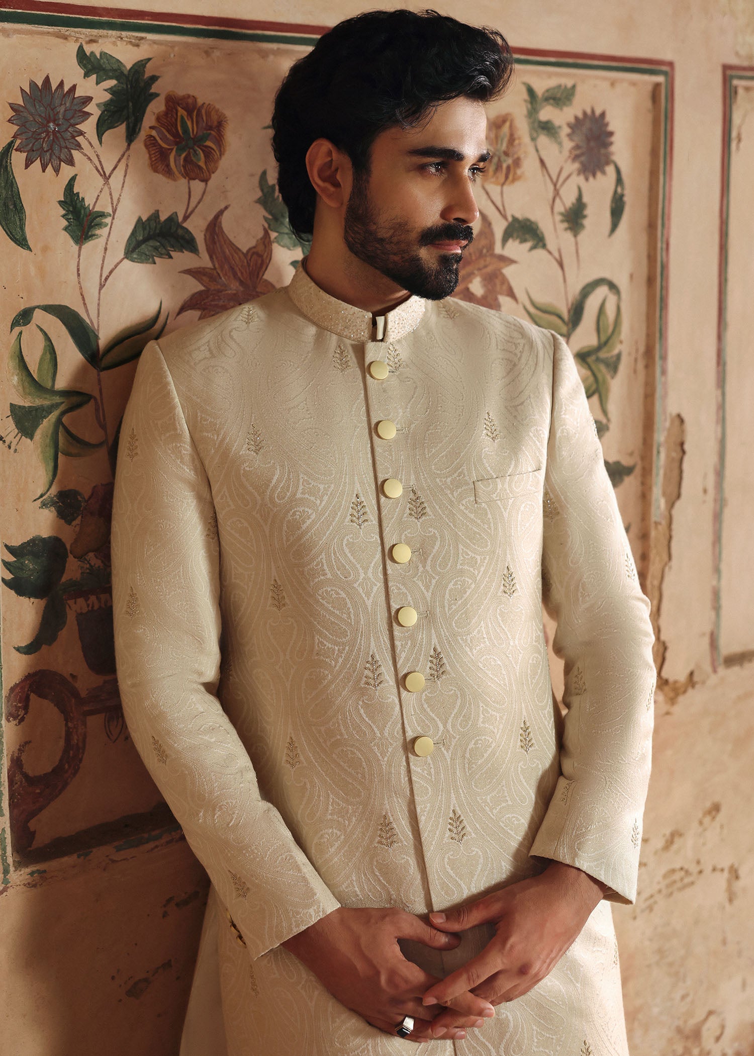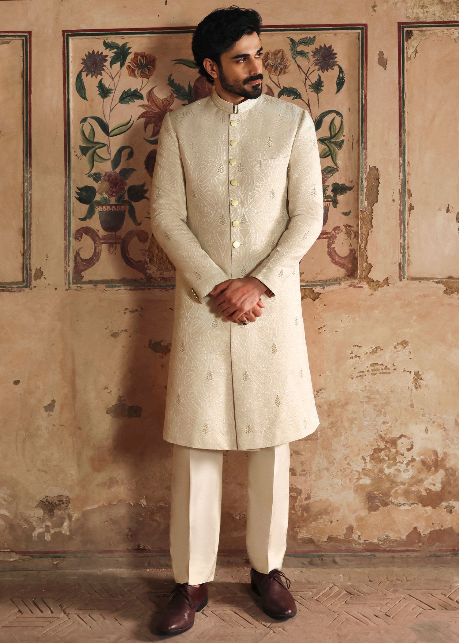 This ivory sherwani exudes quiet sophistication. Crafted in textured fabric with intricate self-embroidery, it features a classic straight silhouette, fabric buttons, and a bandhgala neckline. Paired with tailored ivory trousers - it’s perfect for the big day and ideal for the modern groom who values grace in simplicity.
