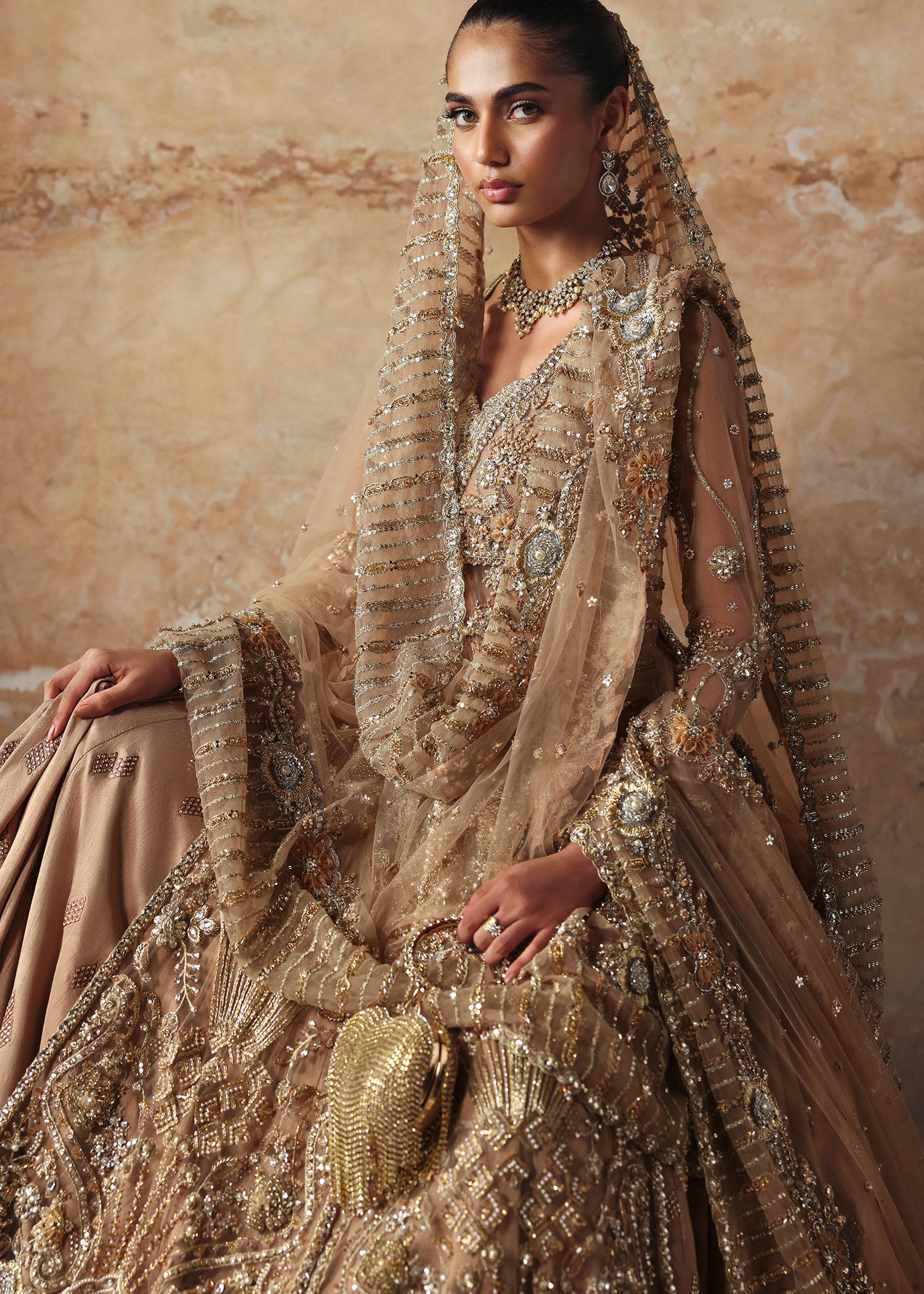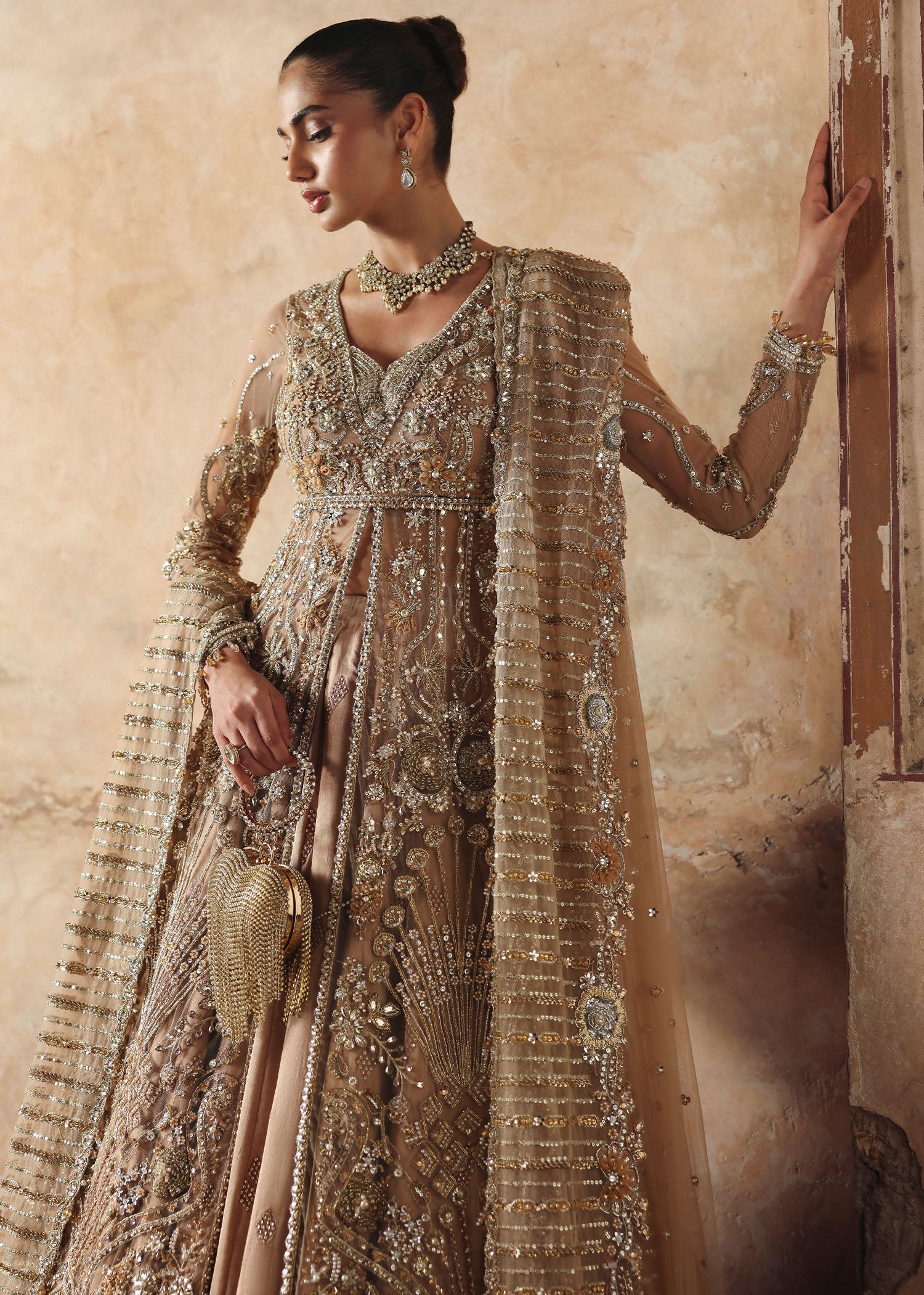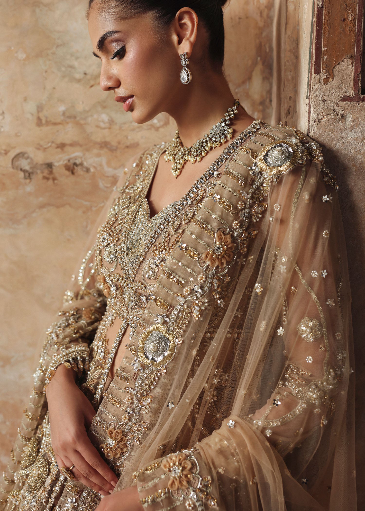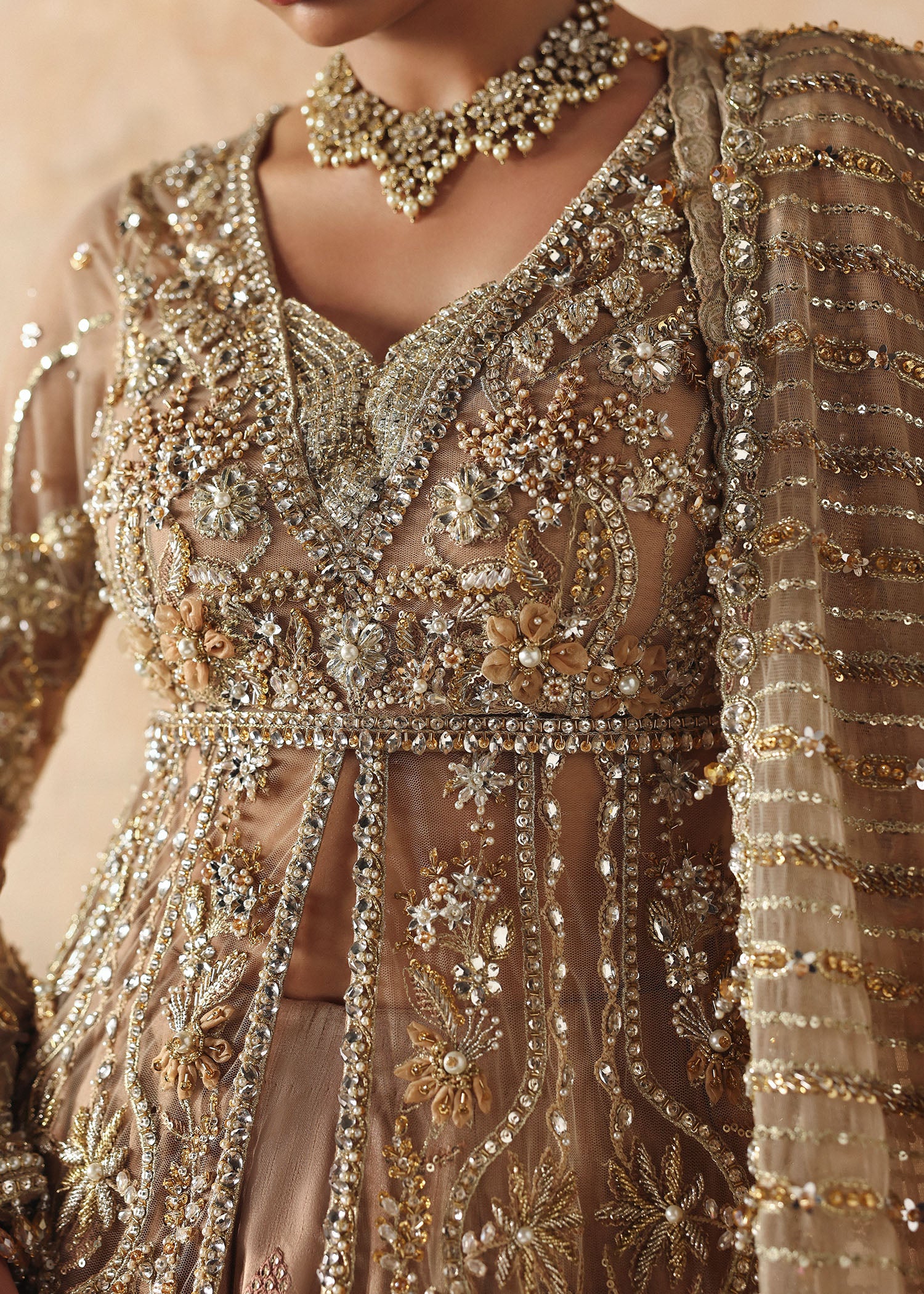 Make a statement with this coffee bridal front-open gown, exquisitely hand-embellished to showcase intricate artistry. Paired with a light contrast lehenga in complementary tones, this ensemble blends modern elegance with traditional charm. The dupatta features delicate hand-embellished horizontal lines along the borders, adding a graceful and refined finishing touch.