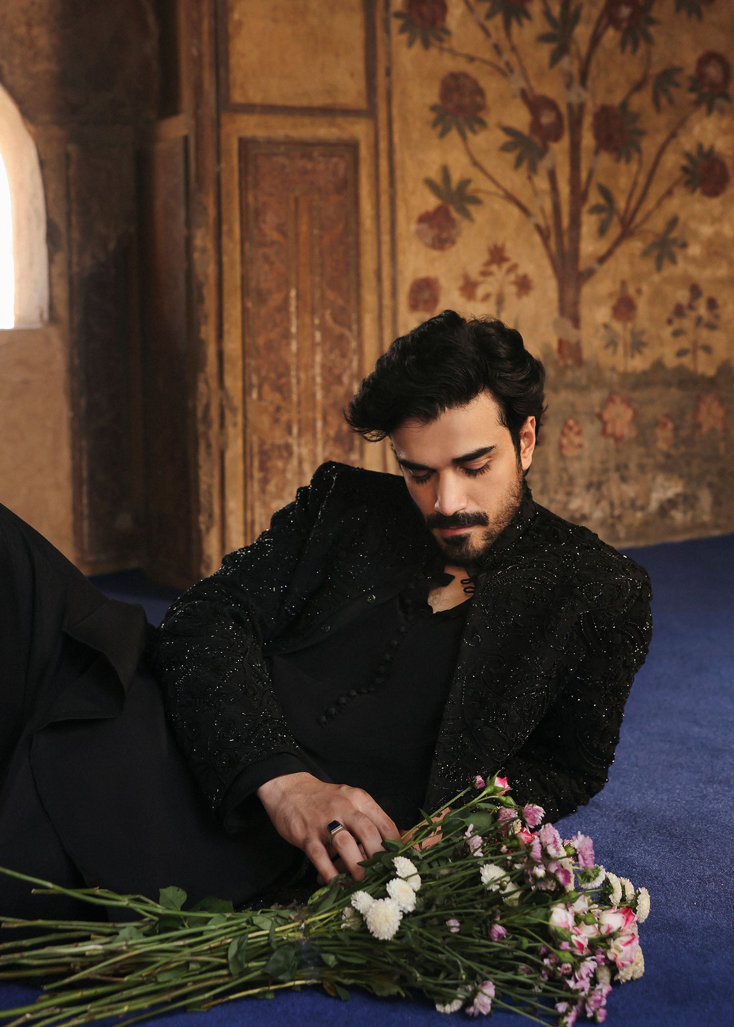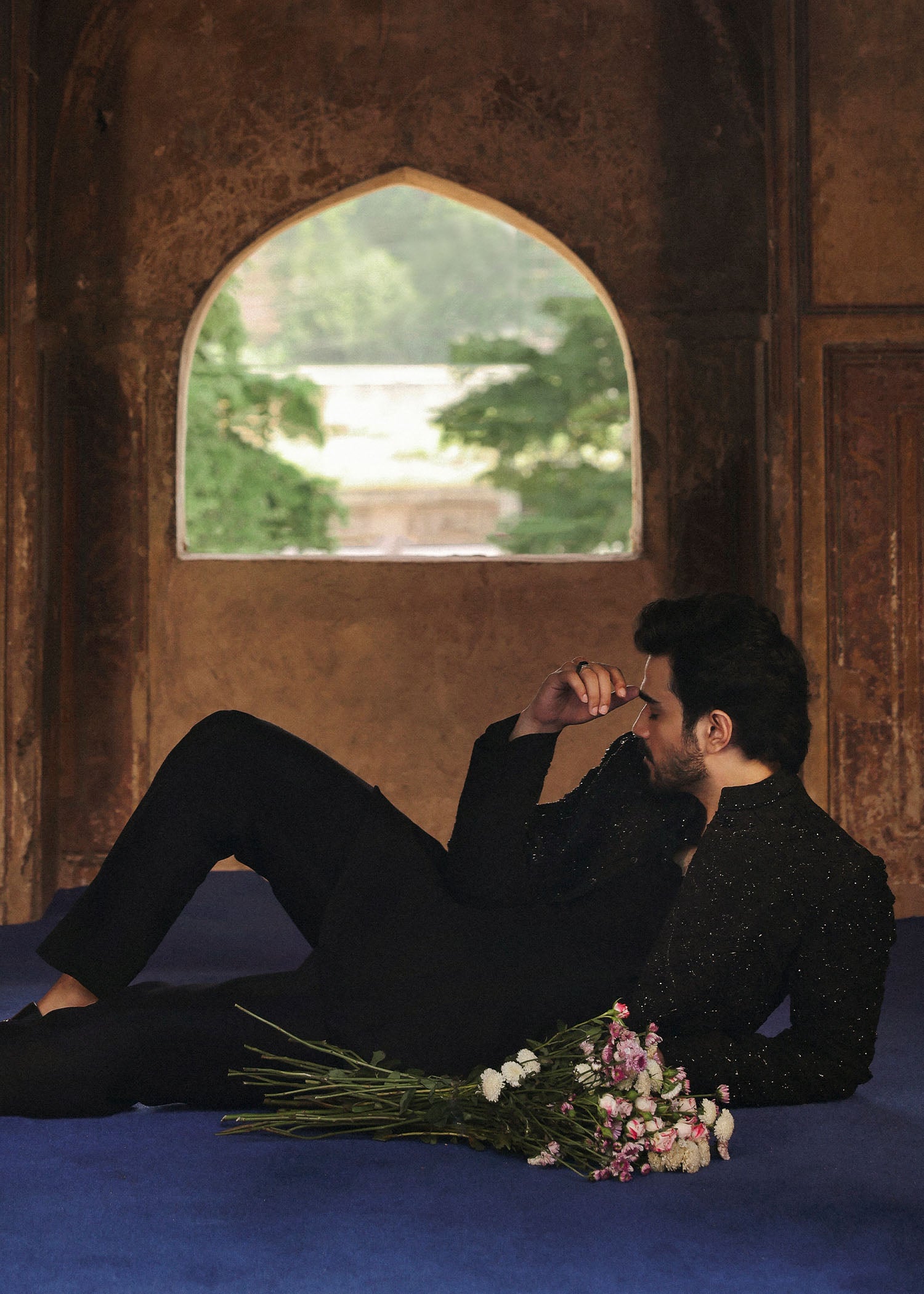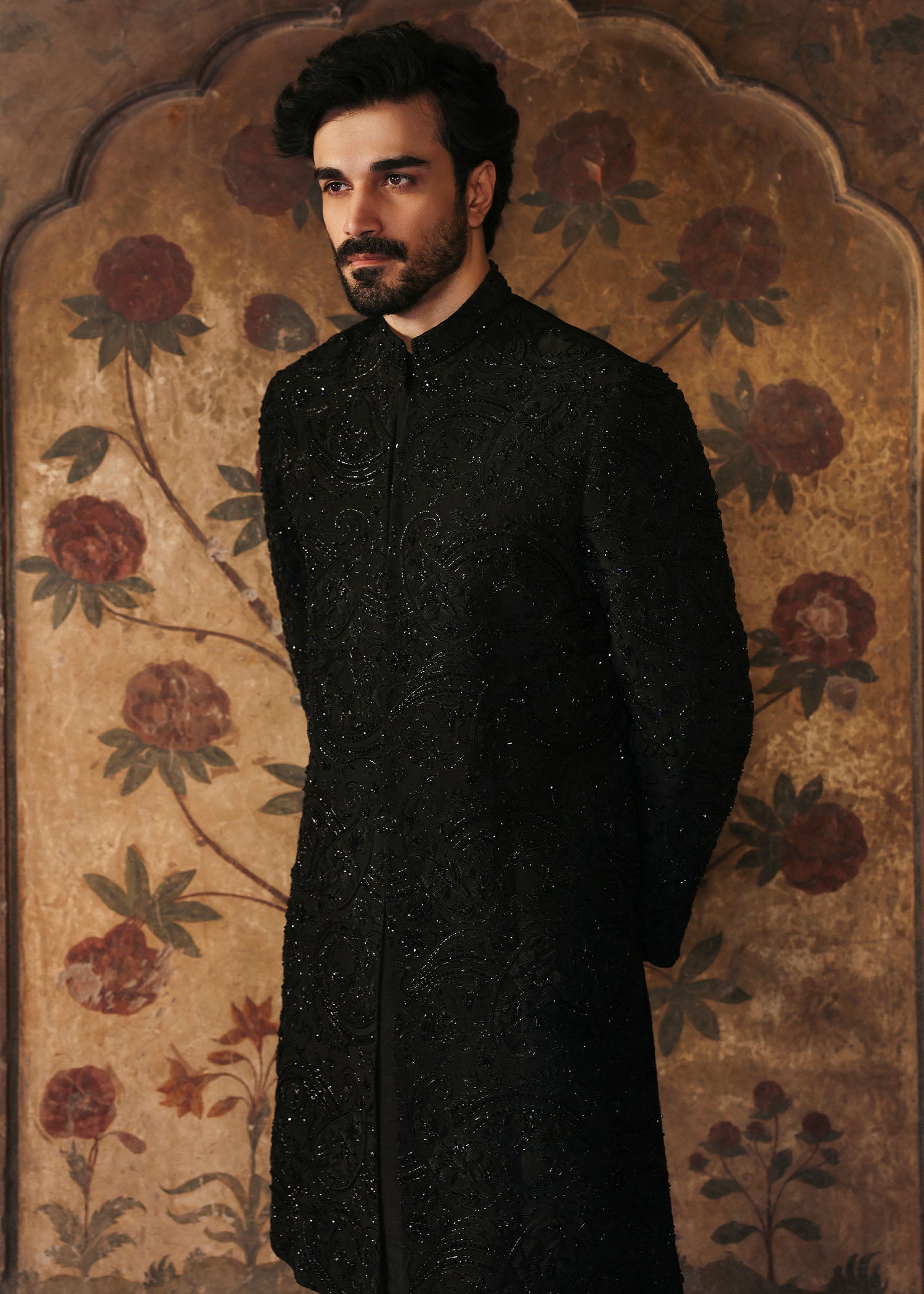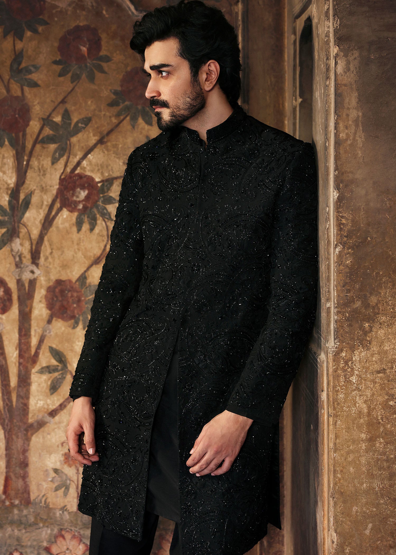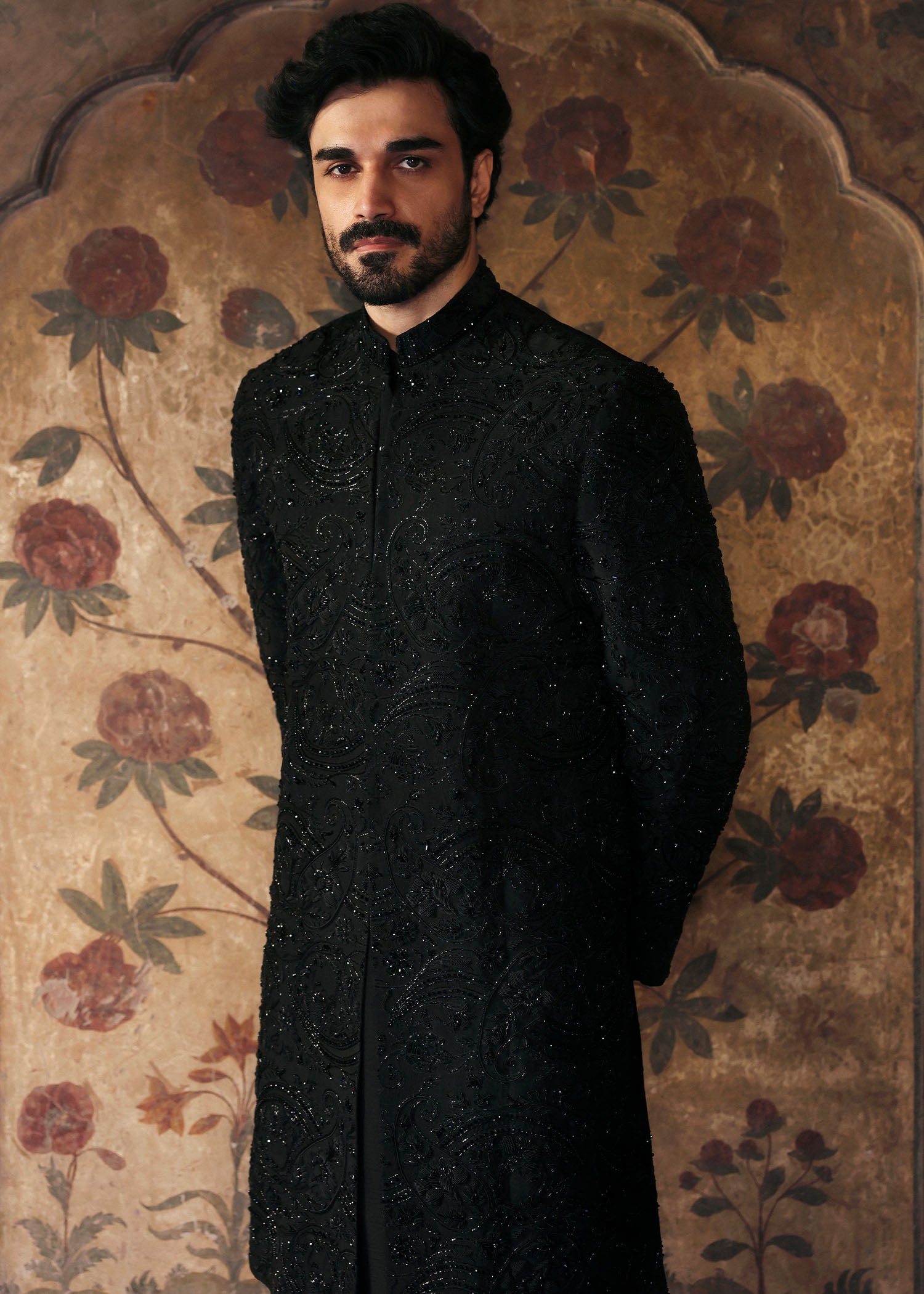 Drenched in deep black and adorned with intricate tonal embroidery and subtle beadwork, this sherwani speaks of quiet power and poetic mystery. The textured embellishments catch the light just enough to command attention without overwhelming the silhouette, making it perfect for evening weddings, receptions, or any event where sophistication is key.