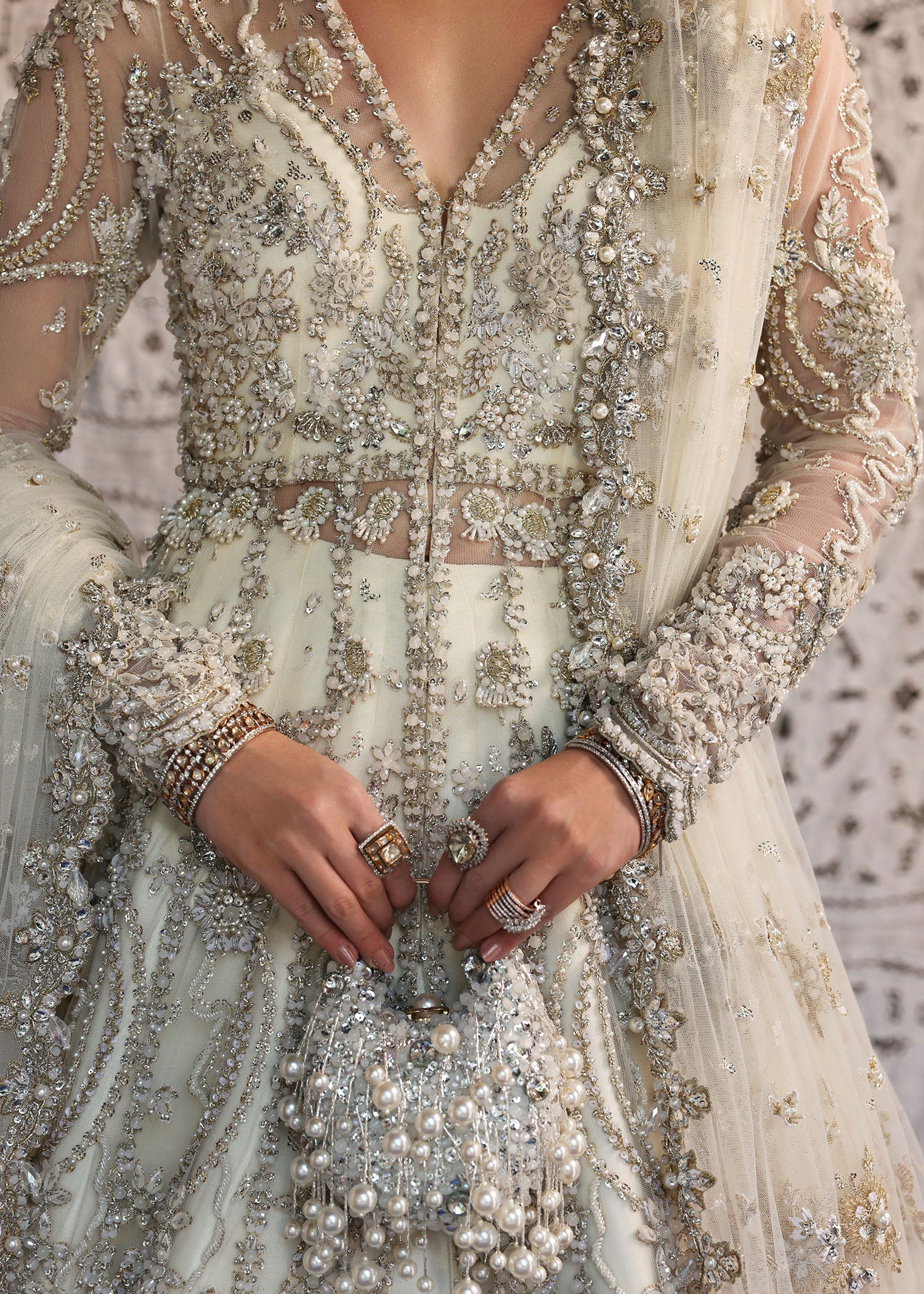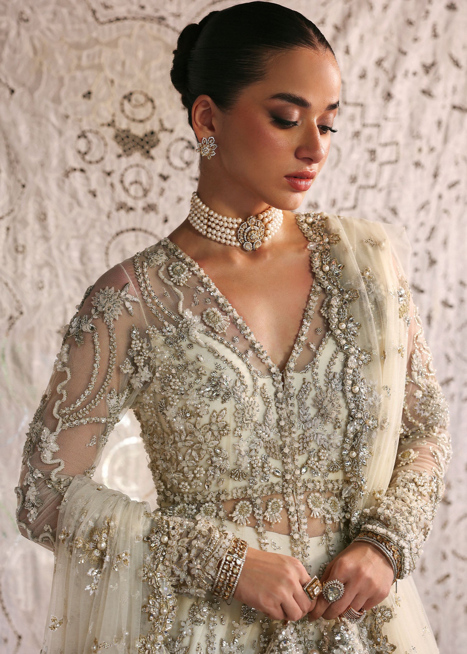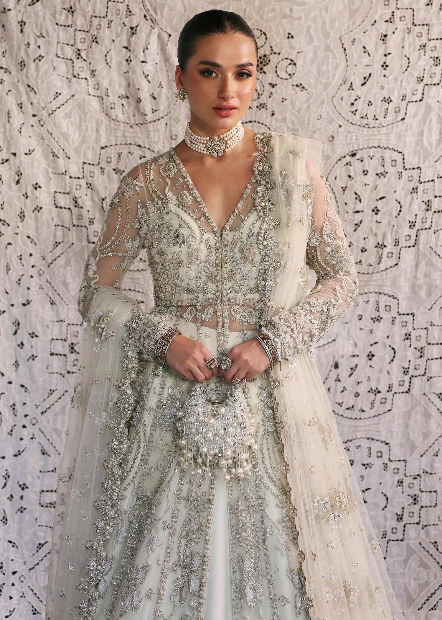 A perfect blend of craftsmanship and modern style, this off-white bridal set includes a front-open gown richly handworked at the bottom, paired with a scalloped dupatta heavily sprayed that adds delicate charm. The lehenga, featuring detailed embroidery at the border completes the luxurious look. Add the matching pouch to elevate your bridal ensemble.