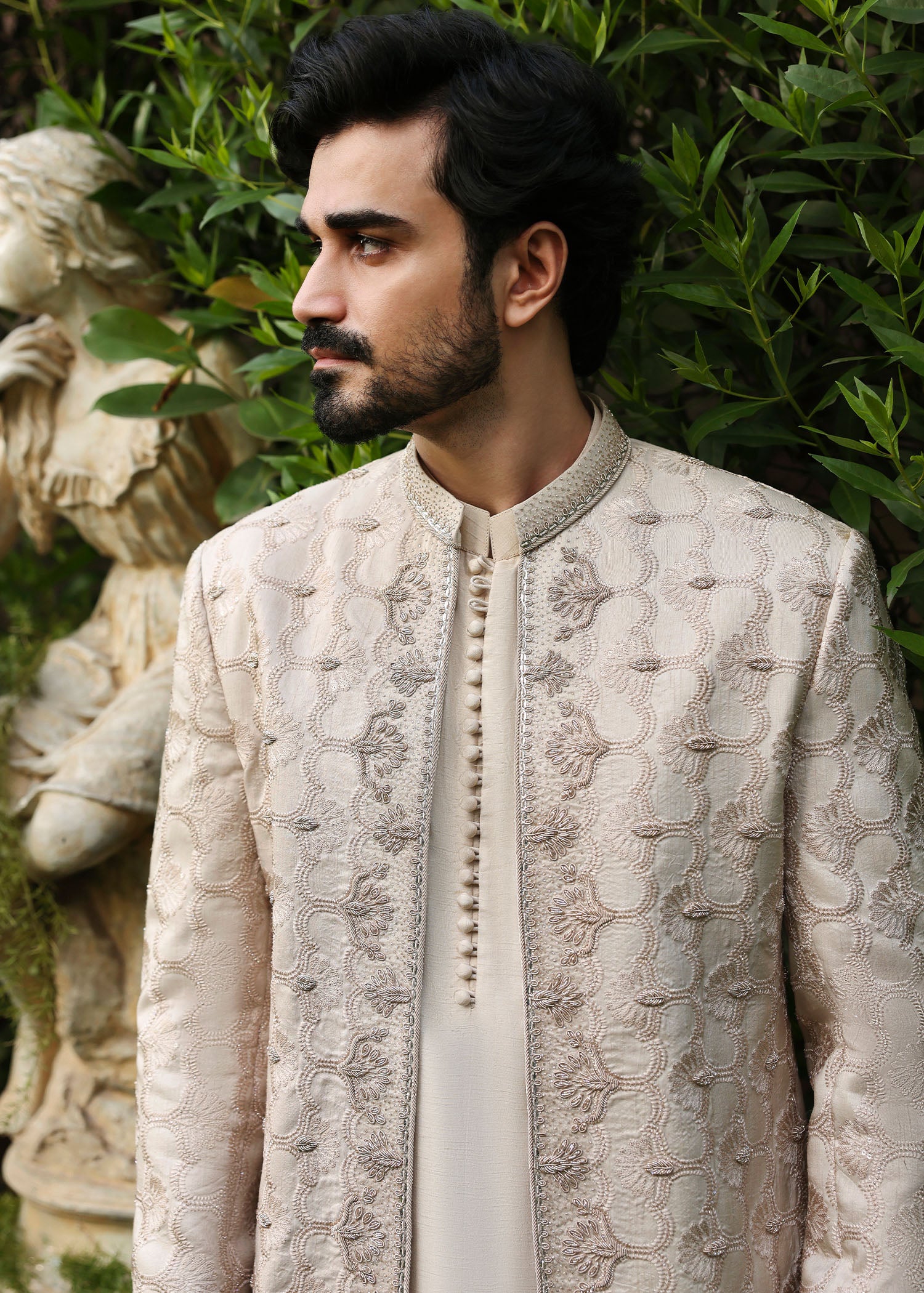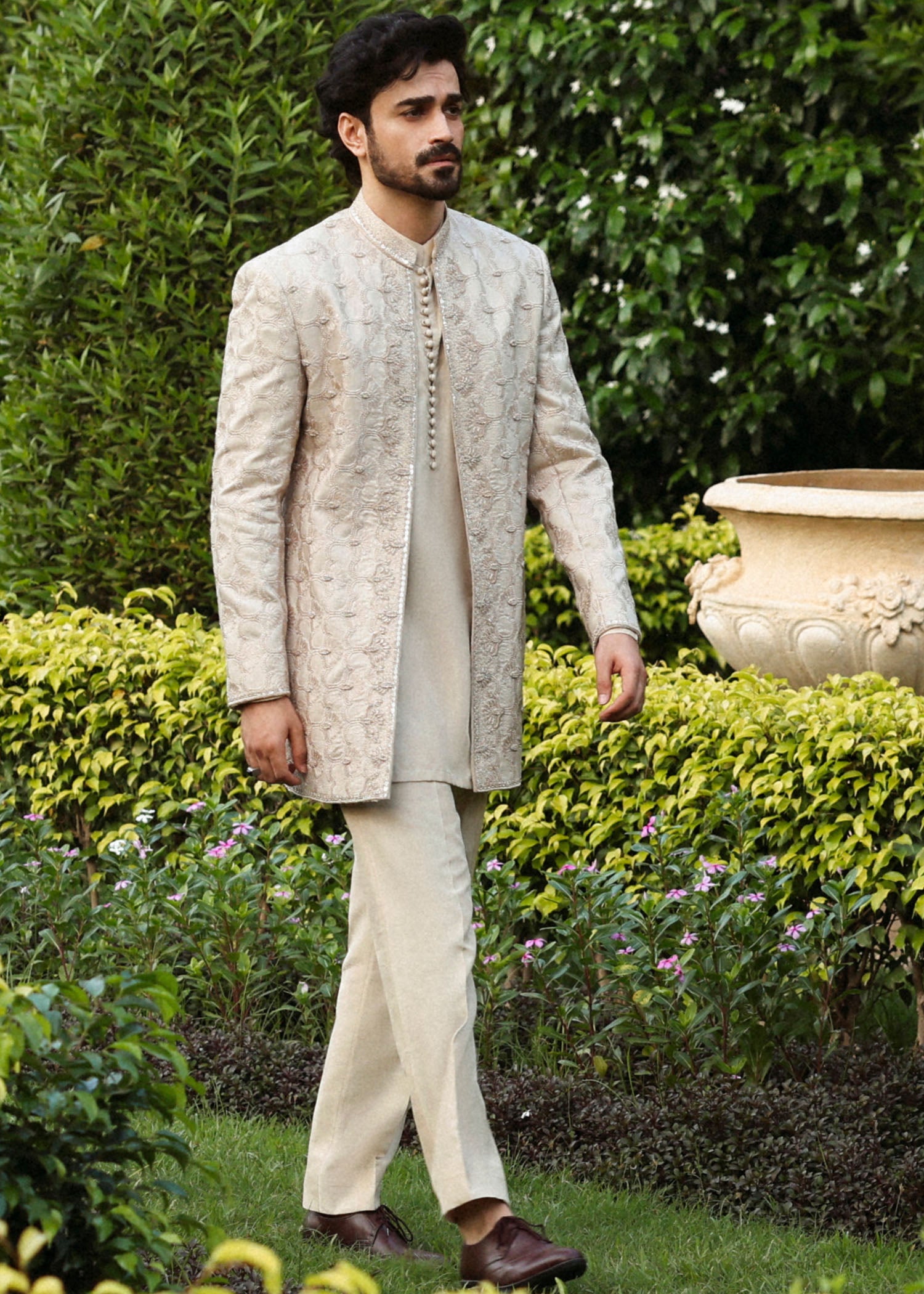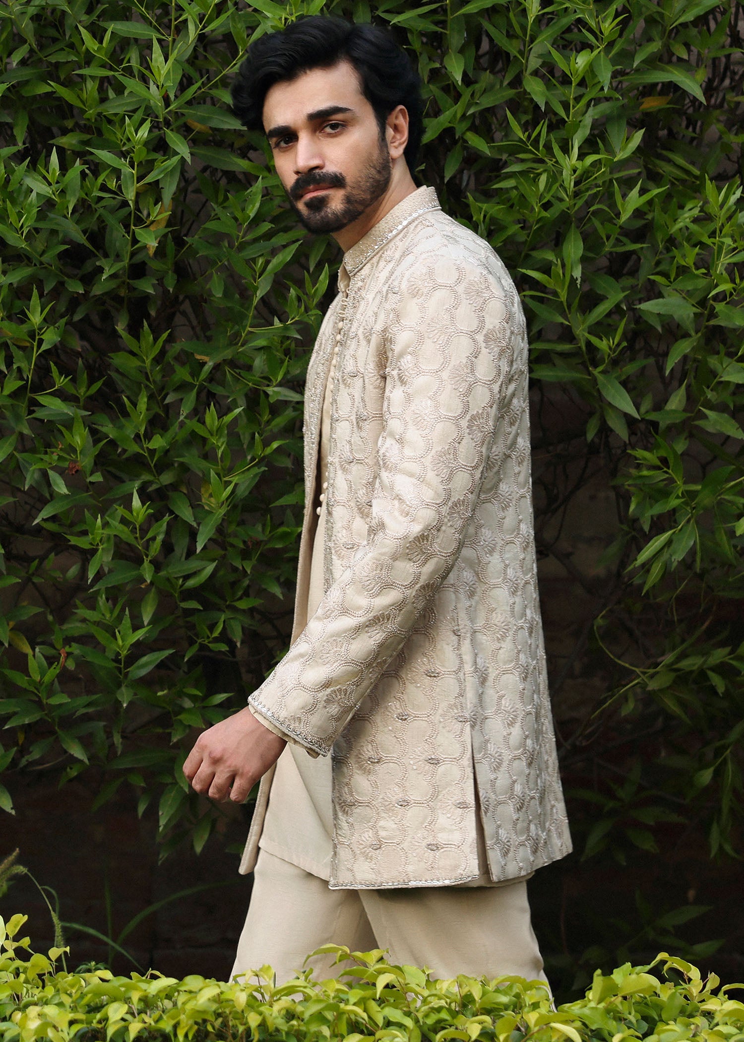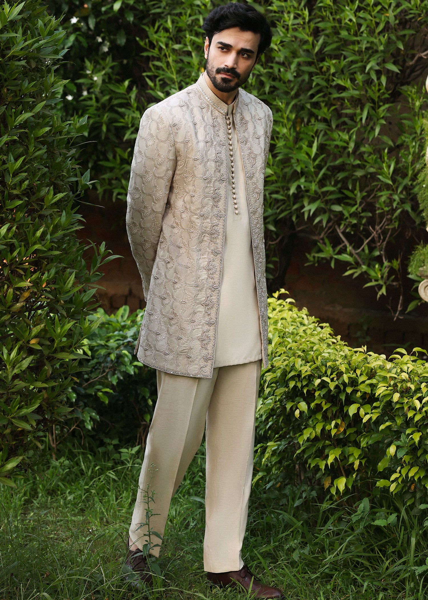 Step into subtle grandeur with this champagne-toned short sherwani. Crafted from soft, luxurious fabric, it features all-over embroidery, fabric-covered buttons, and a classic bandhgala neckline. Perfect for garden ceremonies, it pairs with a matching kurta and trousers for a refined, modern look rooted in tradition.
